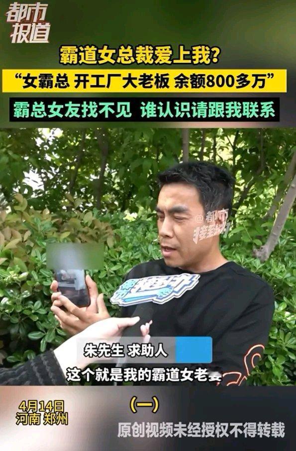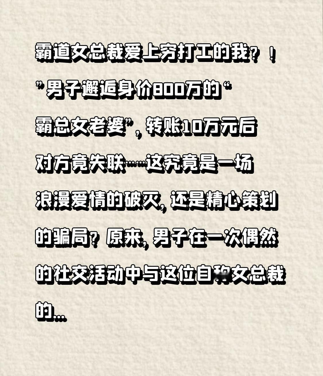霸道女总裁爱上穷打工的我?!”男子邂逅身价800万的“霸总女老婆”,转账10万元后对方竟失联……这究竟是一场浪漫爱情的破灭,还是精心策划的骗局?原来,男子在一次偶然的社交活动中与这位自称女总裁的女子相遇。女子气质不凡,出手阔绰,很快就对男子展开了热烈追求。男子虽出身平凡,但也被女子的热情和财富所吸引,两人迅速陷入“热恋”。