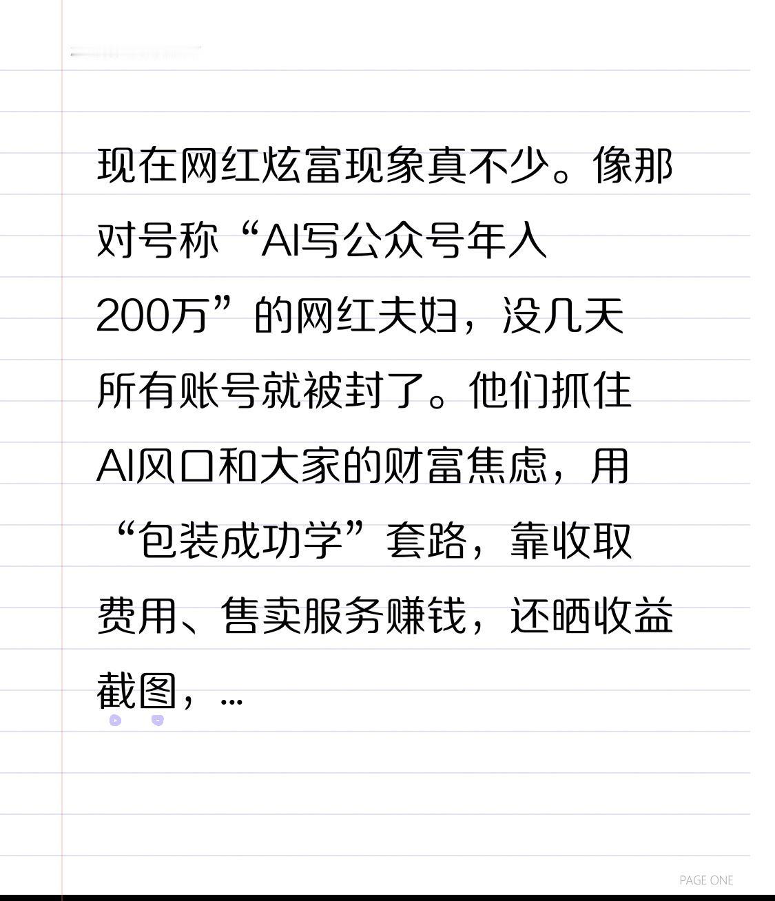 现在网红炫富现象真不少。像那对号称“AI写公众号年入200万”的网红夫妇,没几天所有账号就被封了。他们抓住AI风口和大家的财富焦虑,用“包装成功学”套路,靠收取费用、售卖服务赚钱,还晒收益截图,制造普通人也能轻松暴富的幻象。