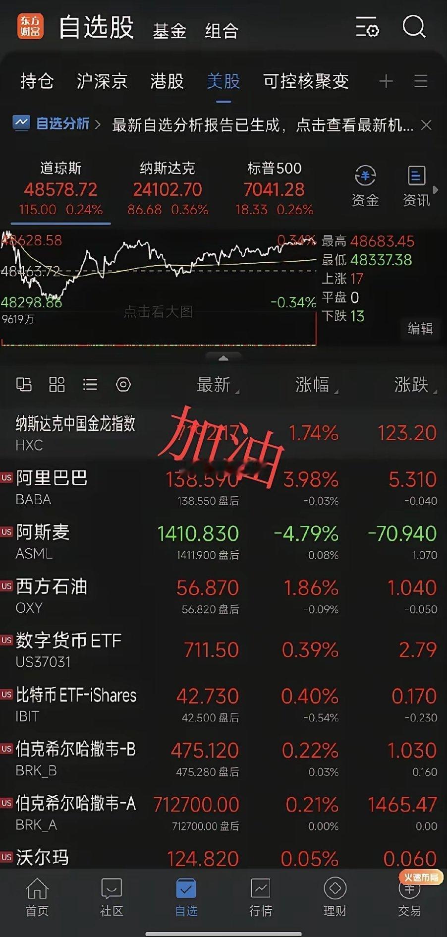 今天继续看好,昨天晚上美股三大指数全部收涨,道琼斯涨0.24%,纳斯达克涨0.36%,标普500涨0.26%,主要科技股方向微软涨2.2%,甲骨文涨5.02%,特斯拉跌0.78%,英伟达跌0.26%,苹果跌1.14%。数字货币,比特币ETF方向全部收涨,西方石油涨1.86%,阿斯麦跌4.79%,纳斯达克中国龙指数涨1.71%,阿里巴巴涨3.98%美股涨得比较好的板块儿是卫星通讯,内地教育股,太空概念,电信业,智慧城市,在线教育,固态电池,CPO共疯装光学等;跌幅比较靠前的是游轮概念,在线旅游,印度科技,航空租赁,CRO,印度概念,旅游观光等昨天晚上美股标普500创历史新高、纳斯达克指数创历史新高。看来美伊战争对美股的影响基本上没有了,对大A的影响倒是还在[捂脸]所以大A如果再不上涨的话就只能在自己这儿找原因了,所以今天依然看好大A继续反弹。希望能来一个大幅度的反弹吧