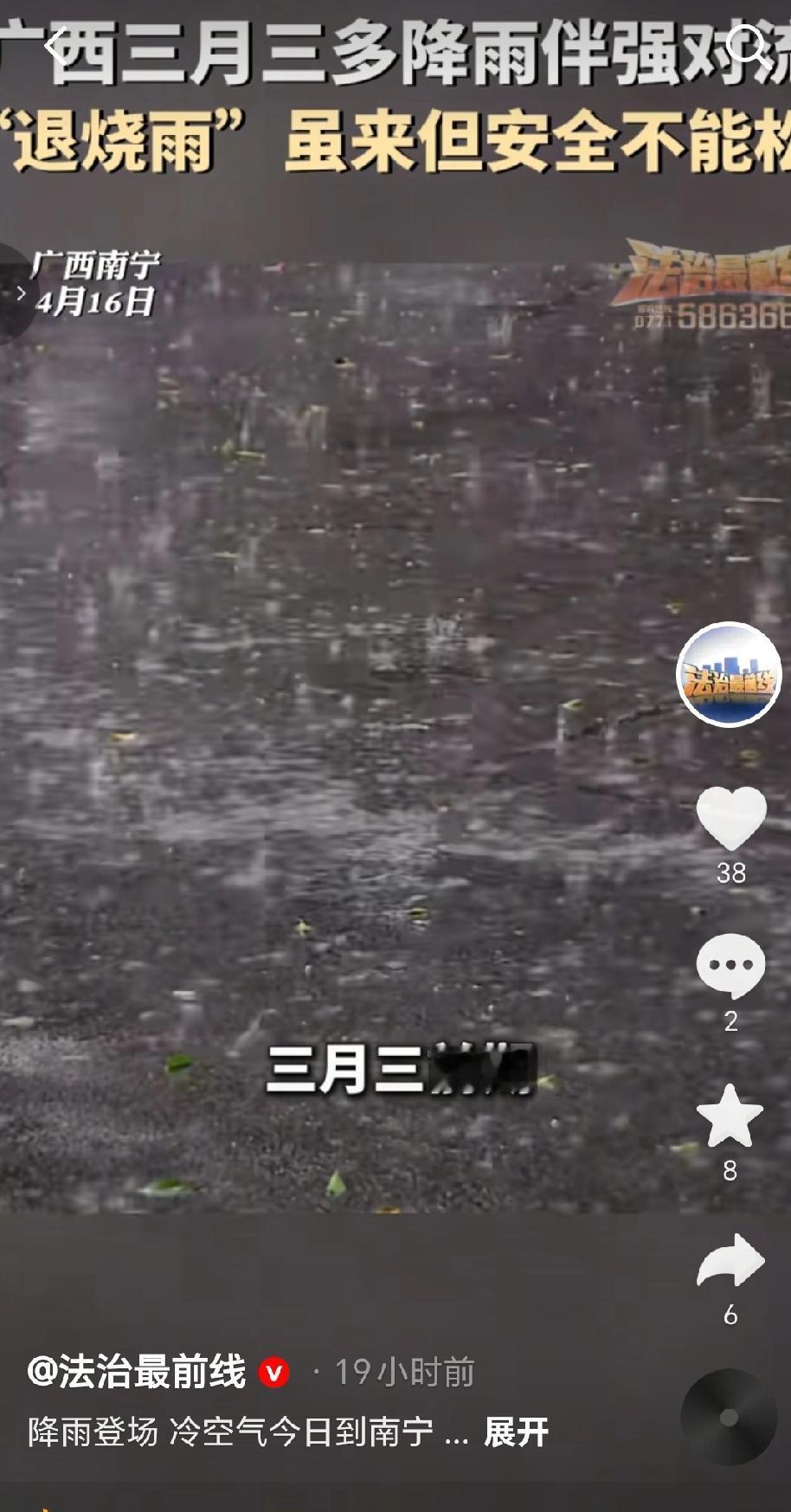 由于受南下冷空气影响,广西三月三前期(4月16日 - 17日)多降雨并伴有强对流天气。南宁有中雨,局地大雨或暴雨,降雨时伴有雷电大风、局地冰雹;桂中桂南中到大雨局部暴雨,其他地区多云有阵雨或雷雨,局部大雨。17日以后,受偏南暖湿气流增强影响,18日 - 20日广西仍多降雨。18日 - 19日桂西小到中雨,其他地区小雨;20日降雨转到桂北,桂西小到中雨、局地大雨,其他地区小雨。同时,由于进入强对流季节,局地仍可能出现雷暴大风和冰雹天气,提醒大家“退烧雨”虽来但安全不能松懈。(来源于@法治进行时 )