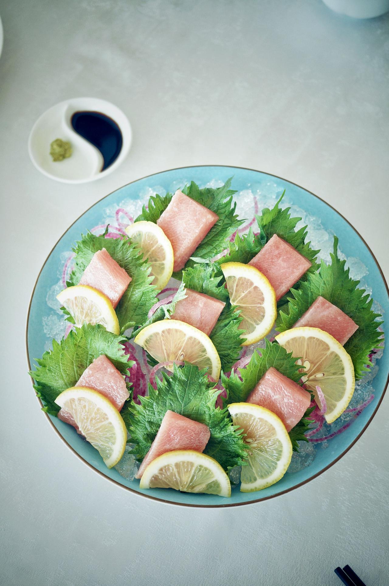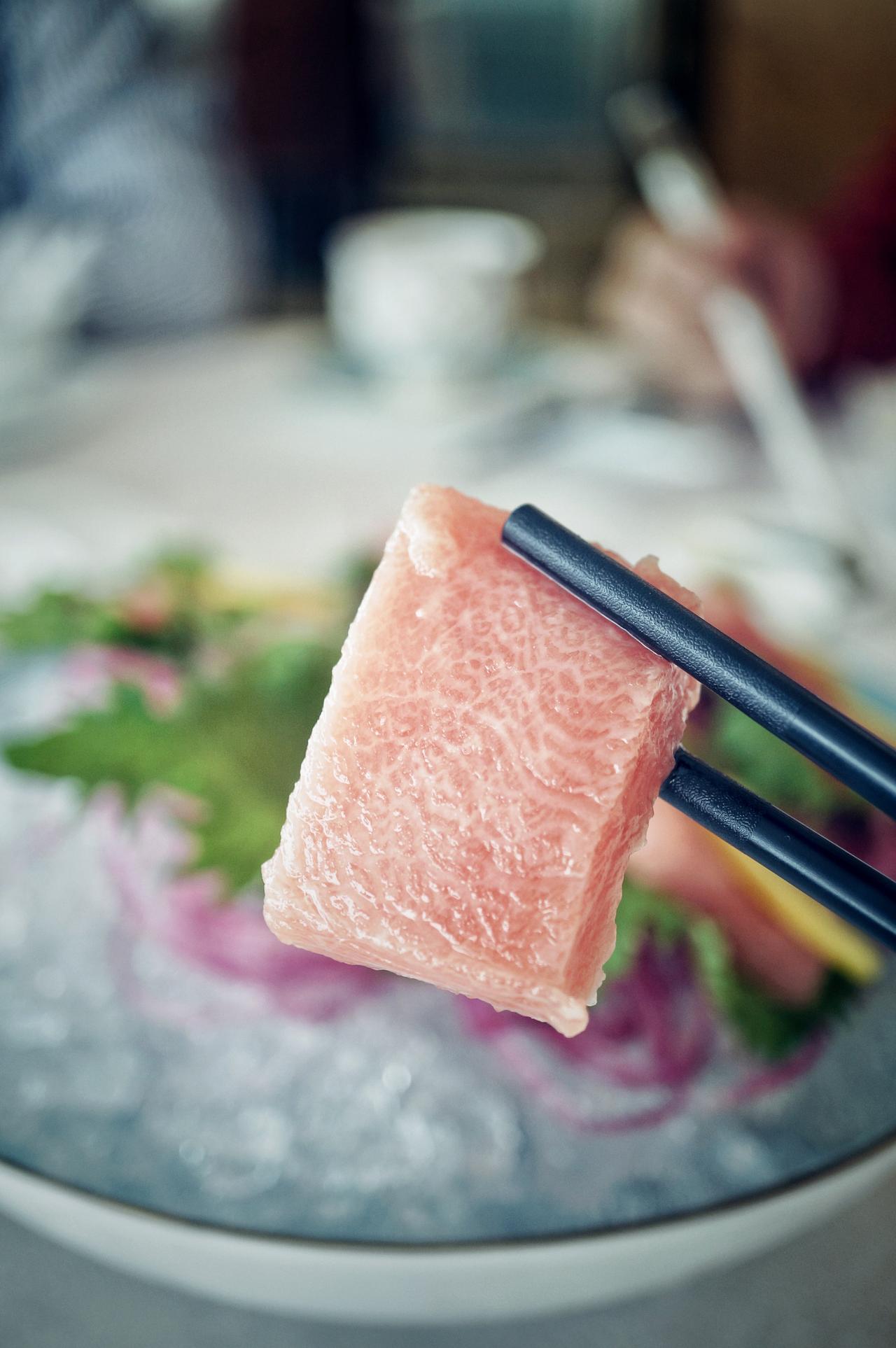 粉红色的鱼肉上布满雪花般的油脂,入口那一瞬间,都不用嚼,抿一下就化在嘴里了,那种脂肪的甘甜和香气直接充满整个口腔。