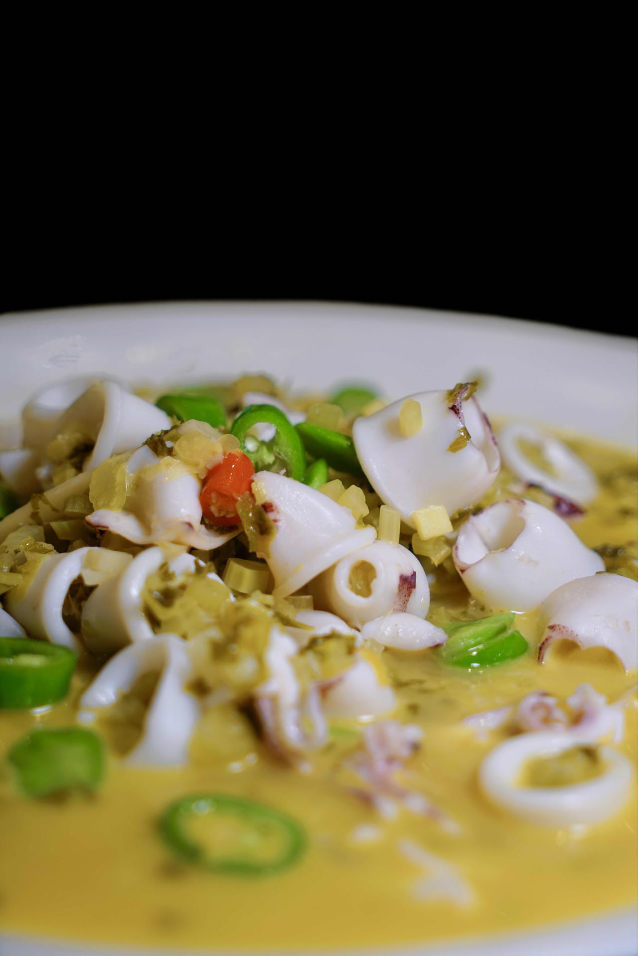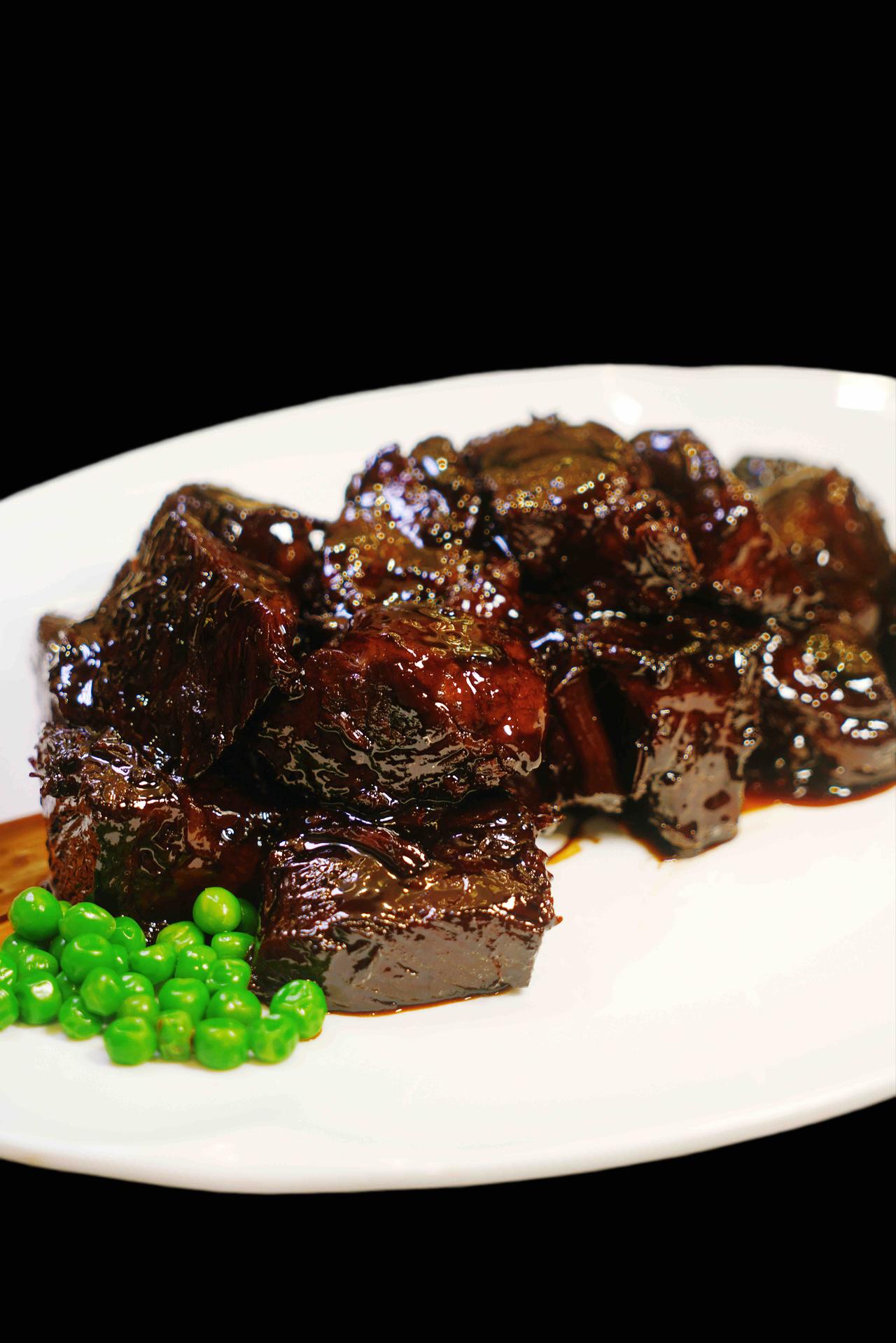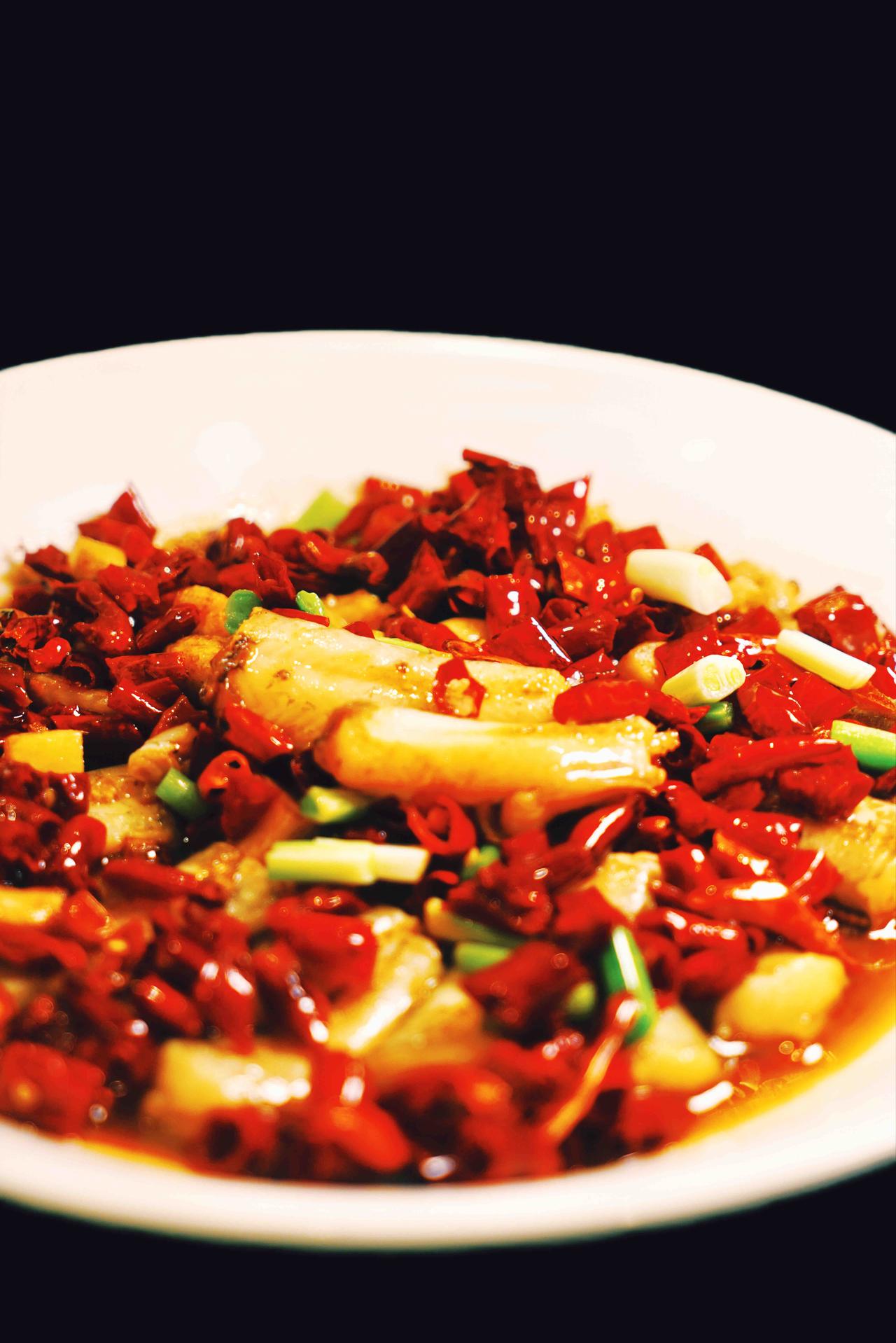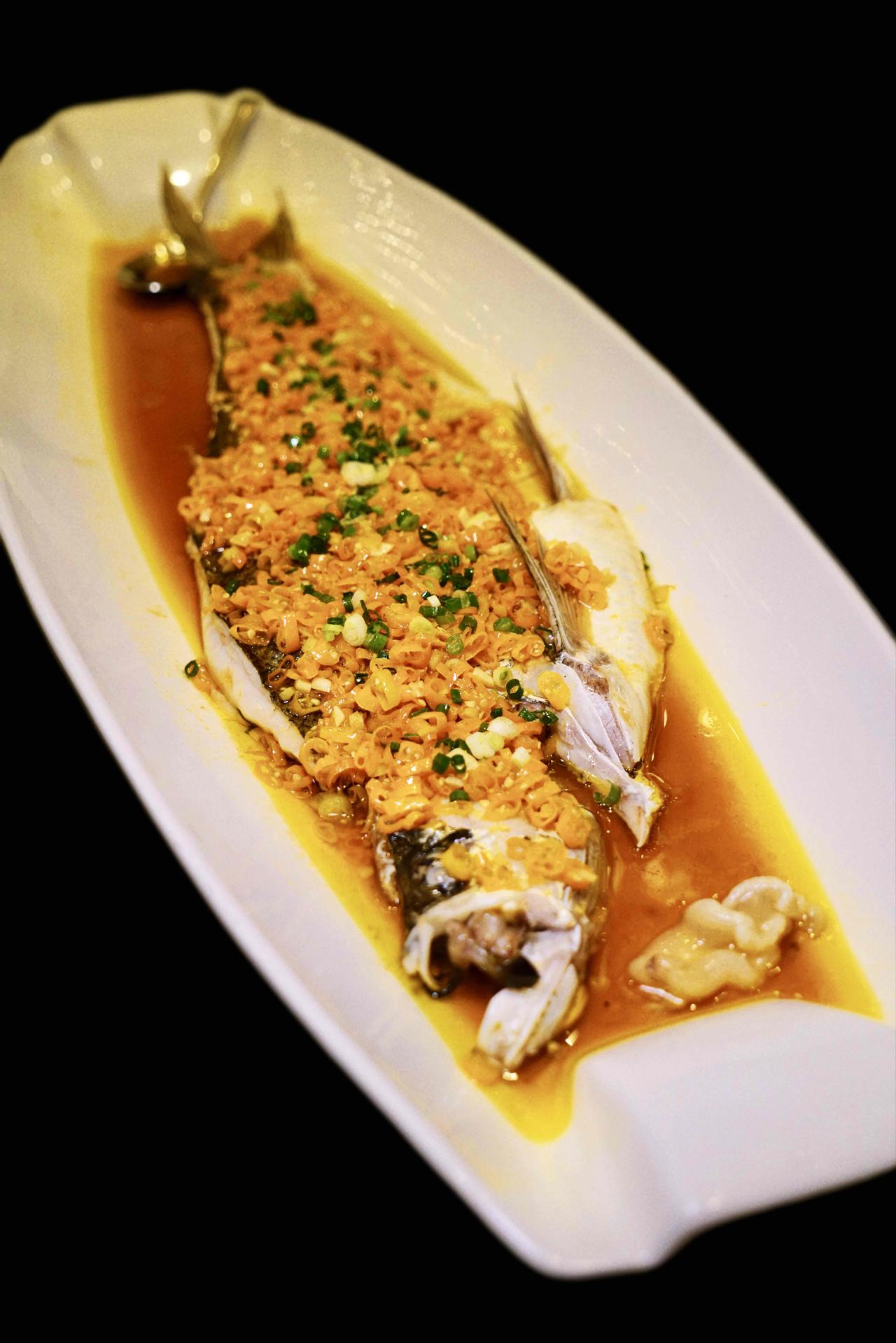 热菜里的黄贡椒清蒸八斤重的翘嘴鱼,鱼胶刚上桌就被抢光,鱼肉鲜而不腥,嫩到用筷子一拨就化,黄贡椒的鲜辣轻轻一裹,鲜、香、辣、嫩俱全,过瘾极了。文火焖雪花牛肉,我们笑称是黑玛丽,看着黑吃着美,入口即是奶香和肉香的完美融合,我一连吃了两块。