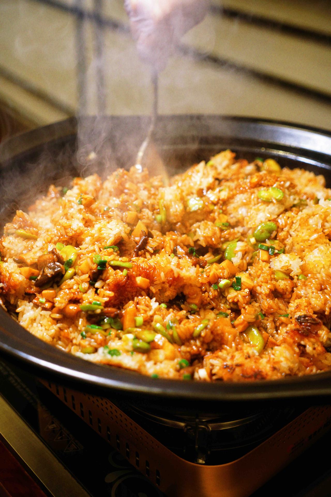 主食是春季煲仔饭,满满一锅春天的气息,锅气十足,米粒分明,调味得当,原本不想吃碳水的我竟然吃得比谁都快,尤其喜欢吃焦香咔嚓的锅巴,那真叫一个香啊。