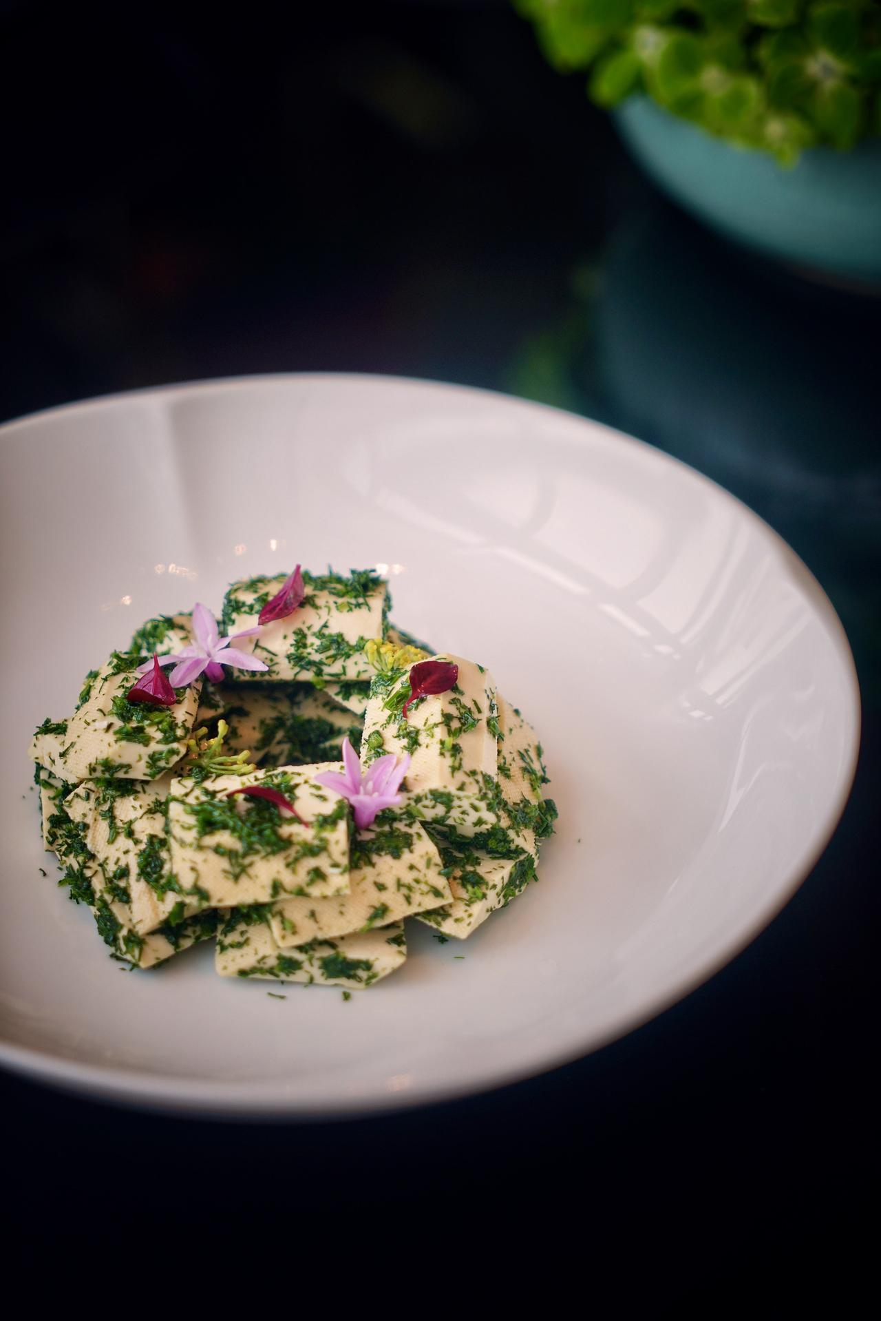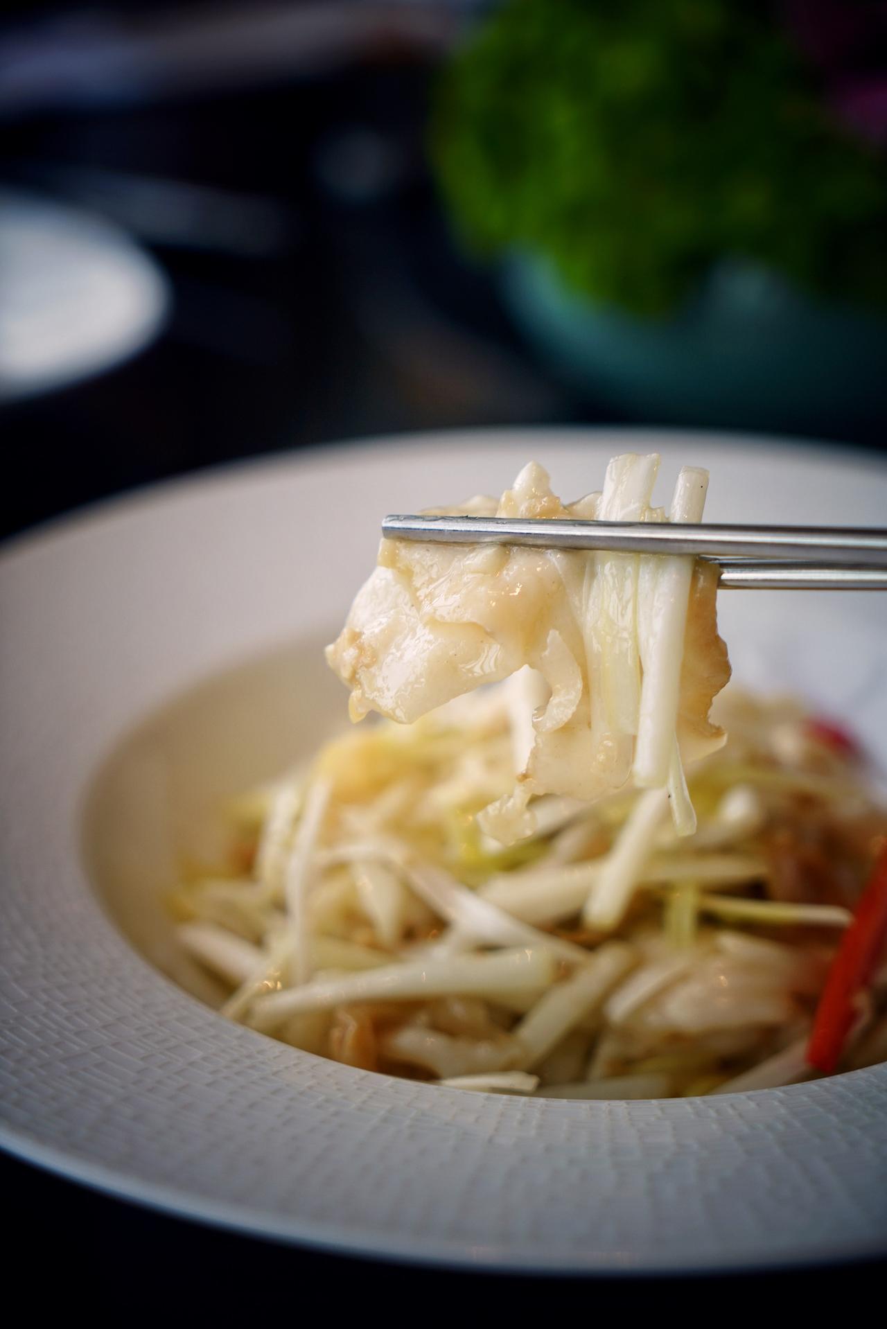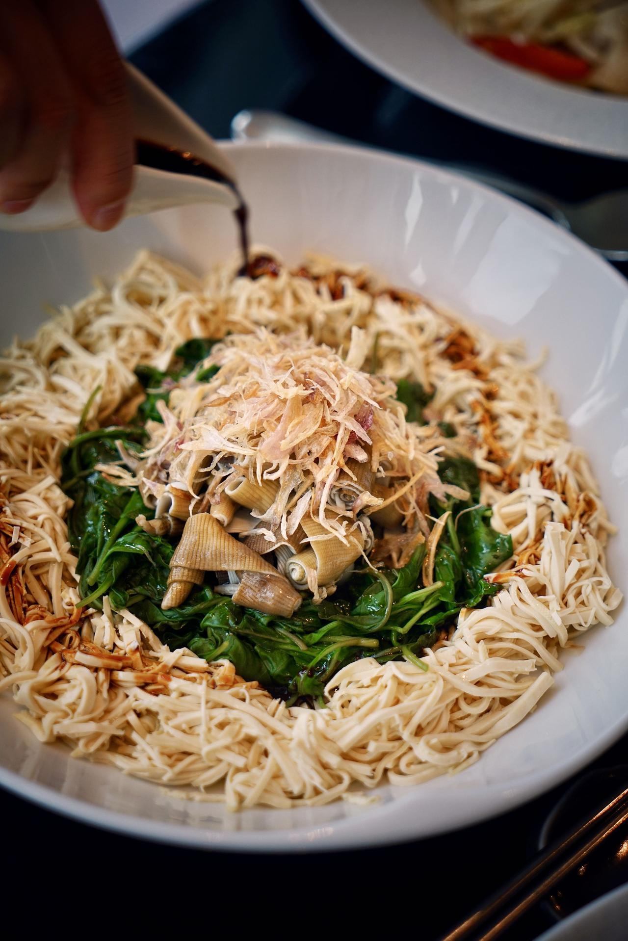⑥红葱油枸杞叶沙肠烫干丝。枸杞叶微微带苦,烟台沙肠有嚼头也鲜美,烫干丝在红葱油的滋润下温润如玉,我们吃着吃着就把春天咽下去了。