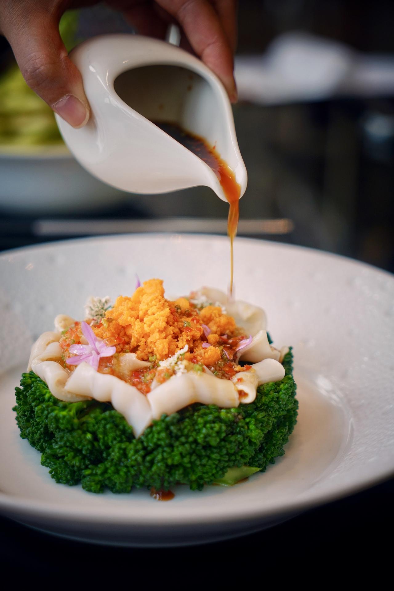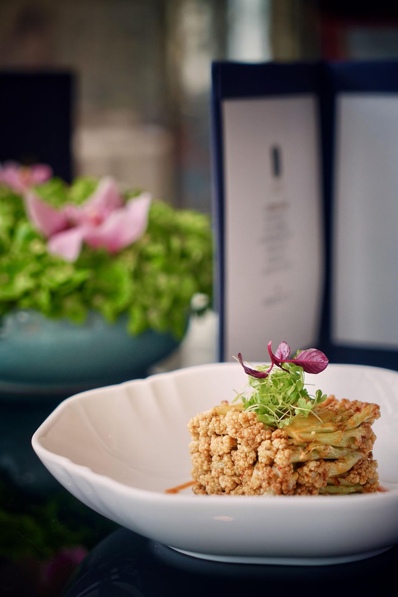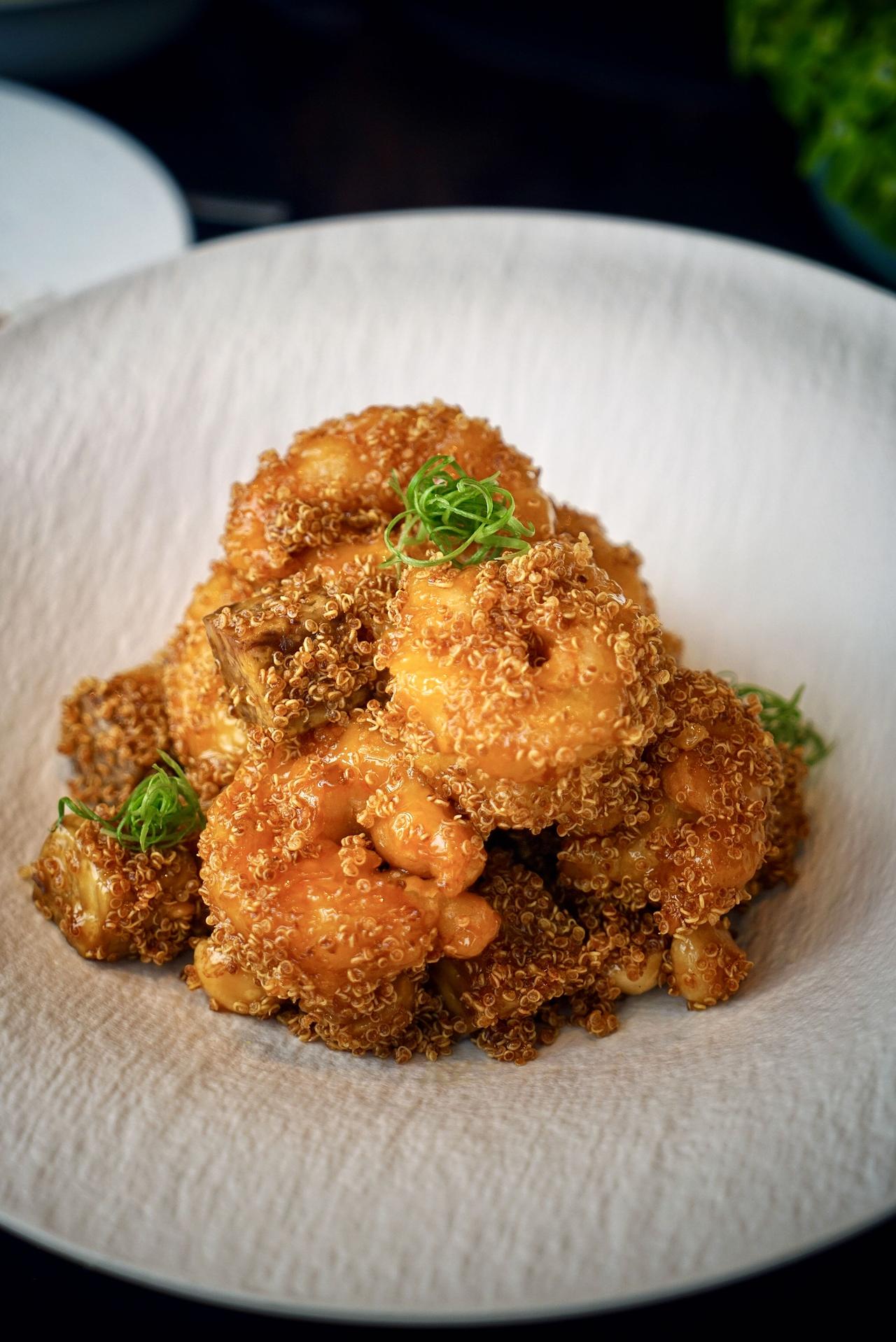 ④藜麦椒麻芋头明虾球。又大又Q的明虾球,裹满了健康的藜麦,蜂蜜和香料油起了脆壳,咬下去“咔嚓”一声,椒麻味像跳跳糖一样在舌尖炸开。杨师傅管这叫“隐形的浓油赤酱”,脆!香!麻!鲜!分寸拿捏得特别准。芋头和果仁是封神的配角,毫不逊色。意犹未尽的我想要再去吃一次!