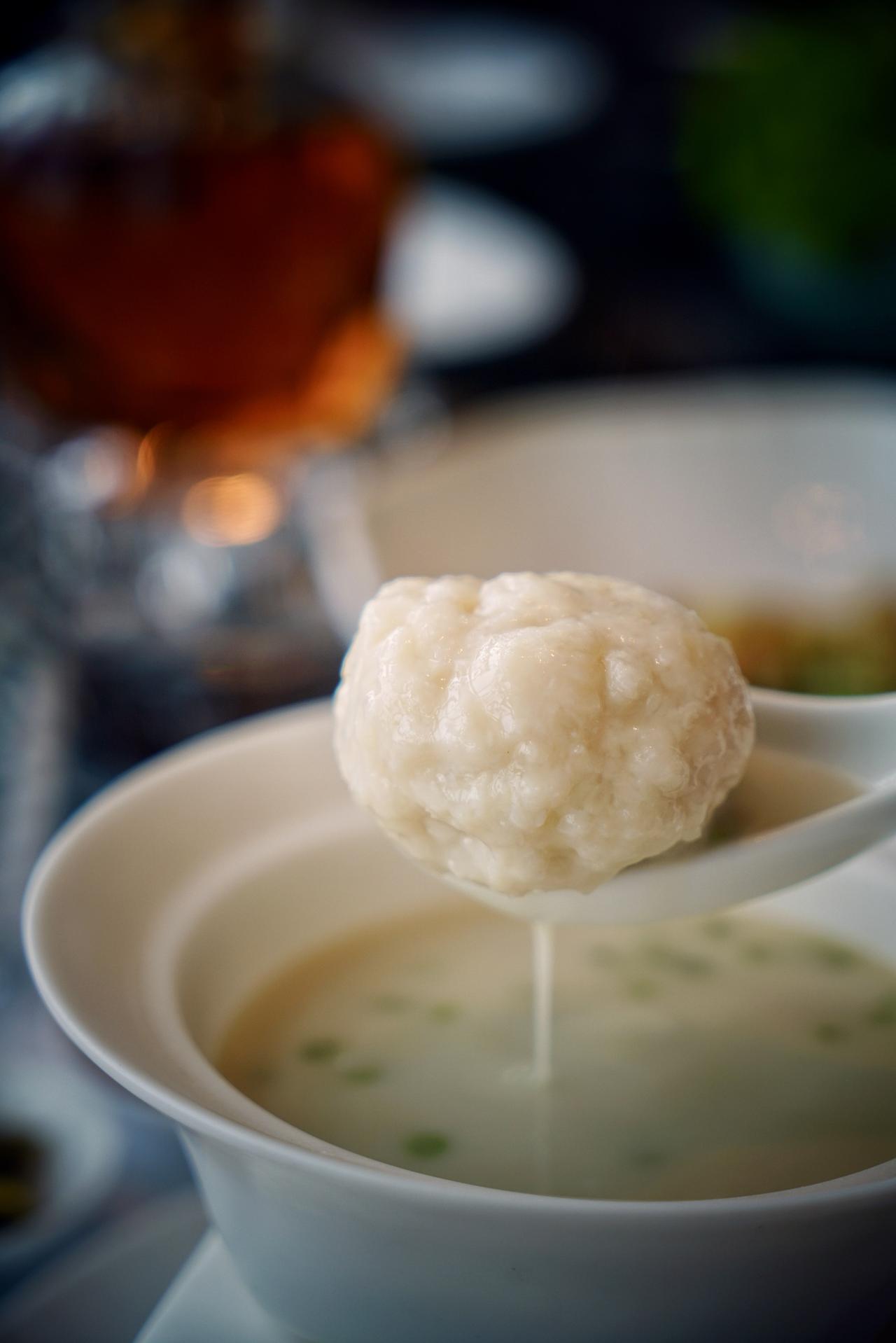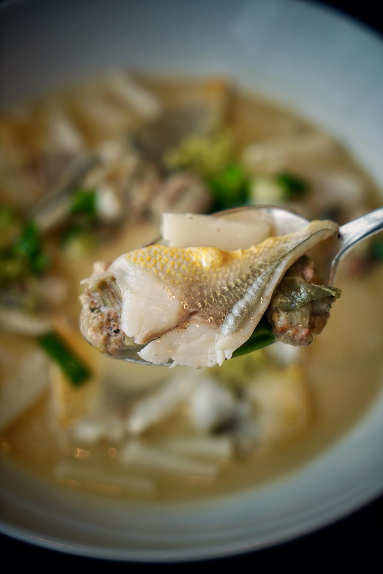 ③芦蒿扇贝狮子头。河鲫鱼和黄鱼熬的奶白汤底,烟台小扇贝躲进了狮子头里,一口鲜下去,江南的细腻和海边的辽阔全在肚子里了。