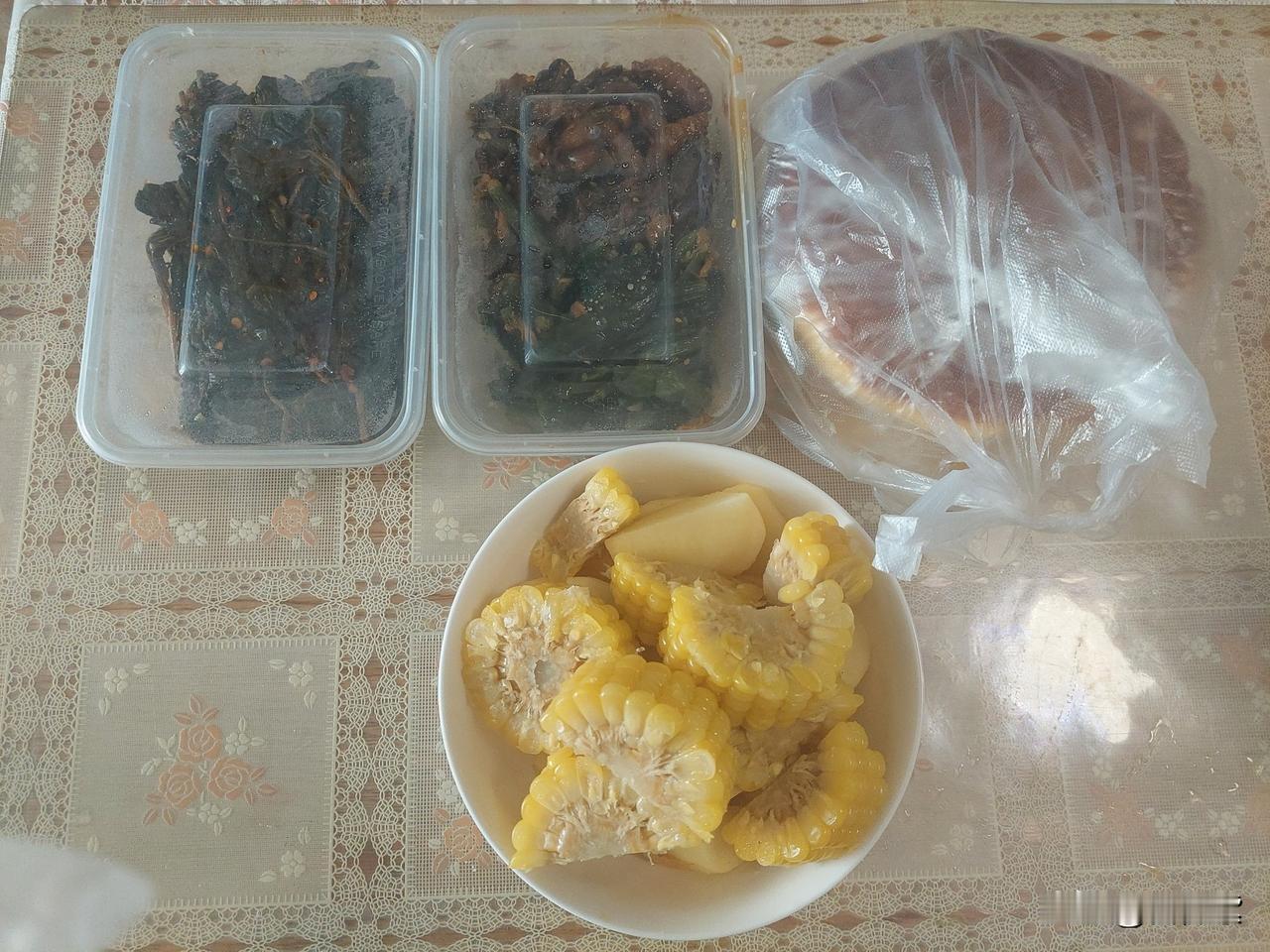 昨天中午出了老年大学,买了路边两盒咸菜,一个苏子叶的,一个八宝菜的,花了18元。