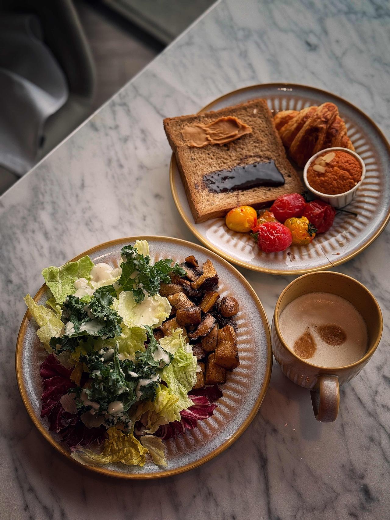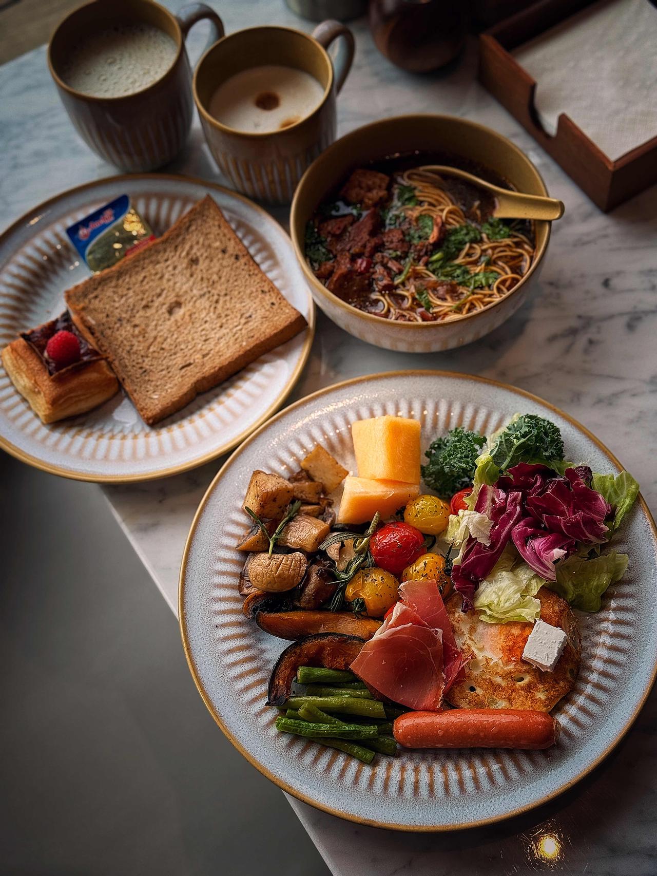 第二天的自助早餐,更是集齐了中、西、苏式精华。小粥小菜、包子豆浆、馄饨面条、现烤面包、现磨咖啡、冷盘热炒、沙拉水果……别人醒了先发呆,我醒了先干饭。生活的小确幸,不过是睁眼就能吃到热乎又丰盛的一餐。