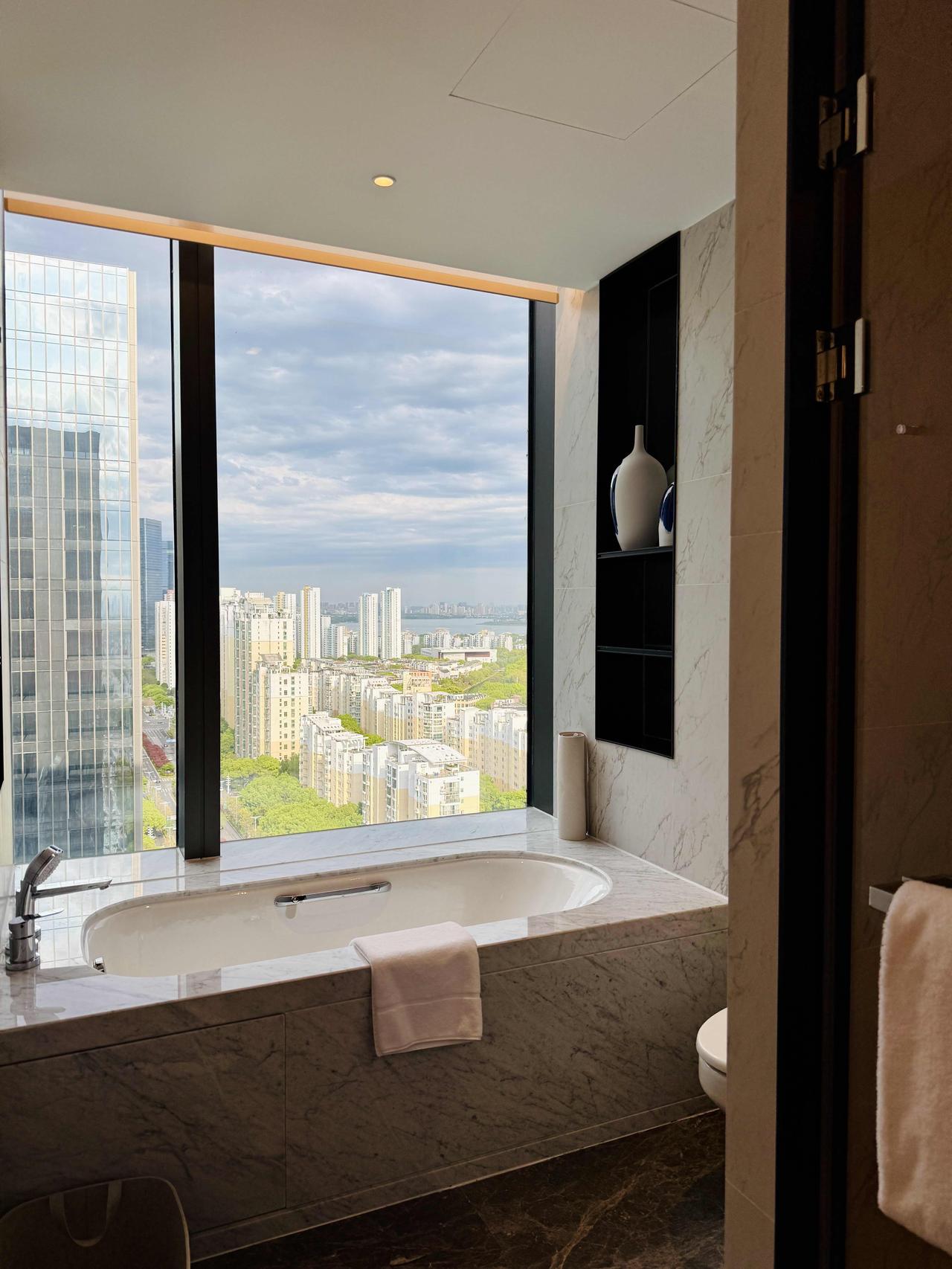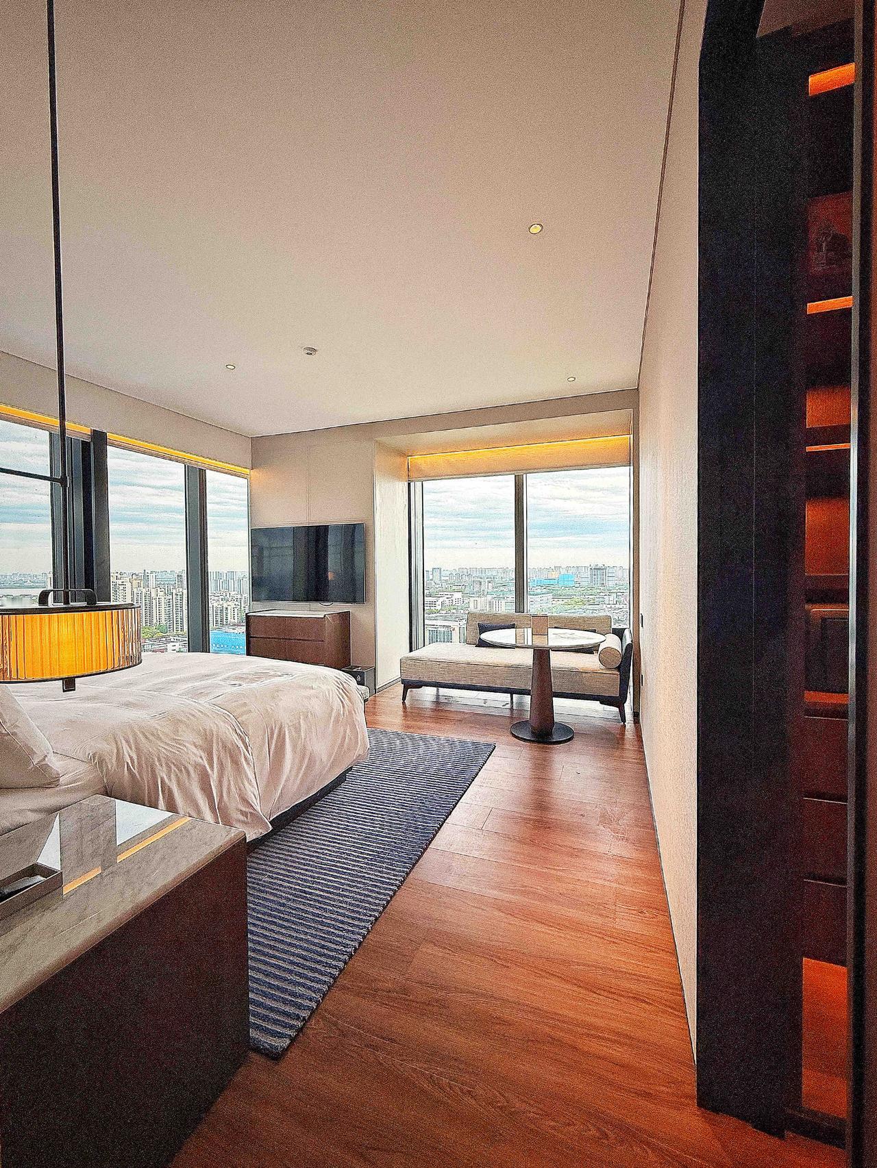 还有20楼的云端高度,那种豁然开朗的爽感,不是一般酒店能给的。不夸张地说,整个园区的繁华都被这扇落地窗框住了。东方之门近得像伸手就能摸到,金鸡湖在远处闪着碎光。坐在房间里,躺在沙发上,白天看车流穿行,晚上看万家灯火,比刷短视频上头多了。
