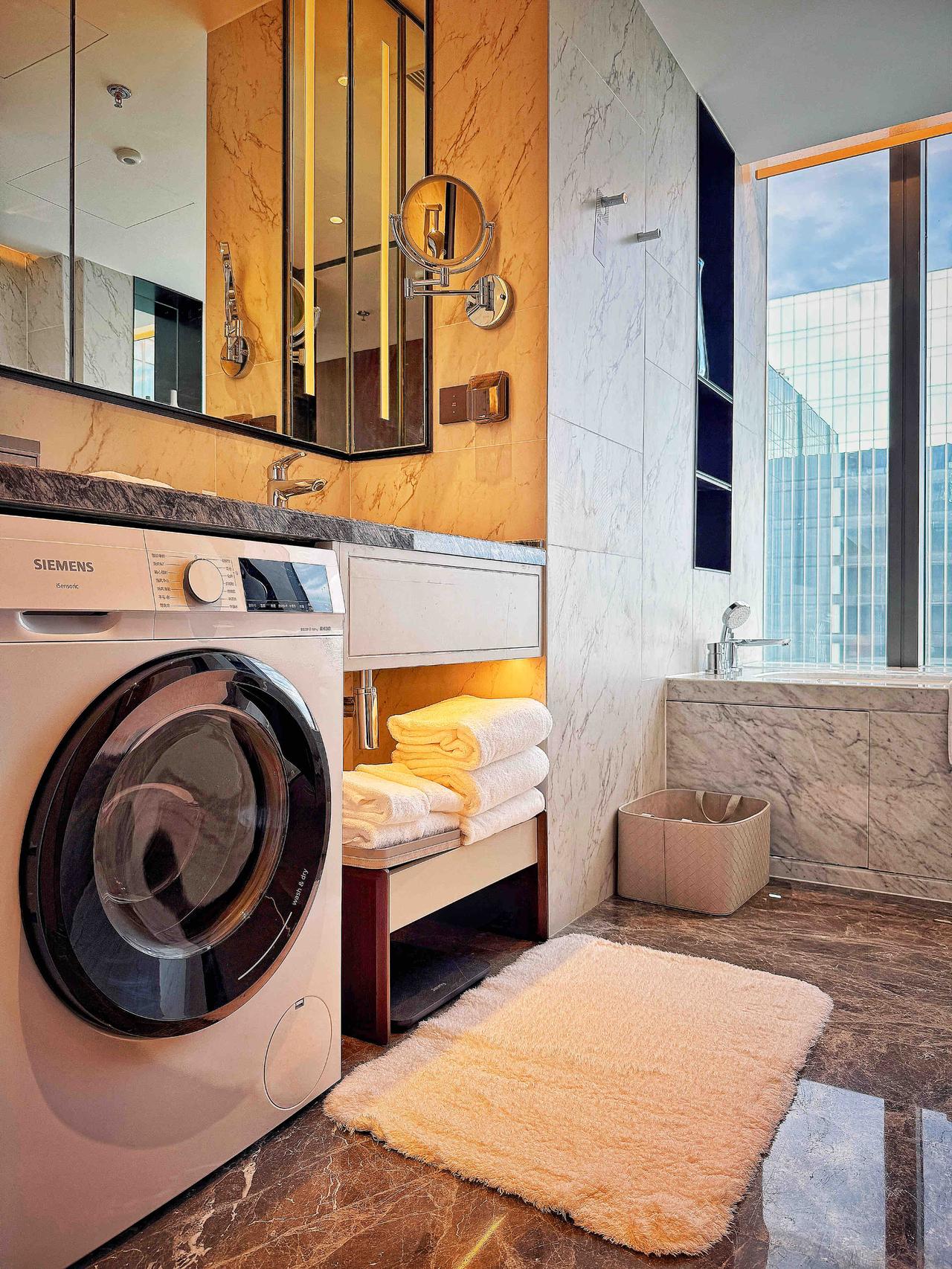 房间里电器够新够全,电磁炉、微波炉、洗碗机和油烟机,冰箱比我自家那个还大,洗烘一体的洗衣机安静地蹲在卫生间角落。最戳人的是细节,空气净化器、直饮水设备,甚至连红酒杯都备好了。