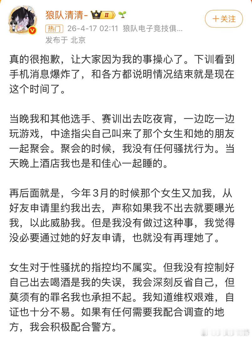 清清否认性骚扰俱乐部与清清表示会全力配合警方调查,请大家不信谣不传谣,静待事实。
