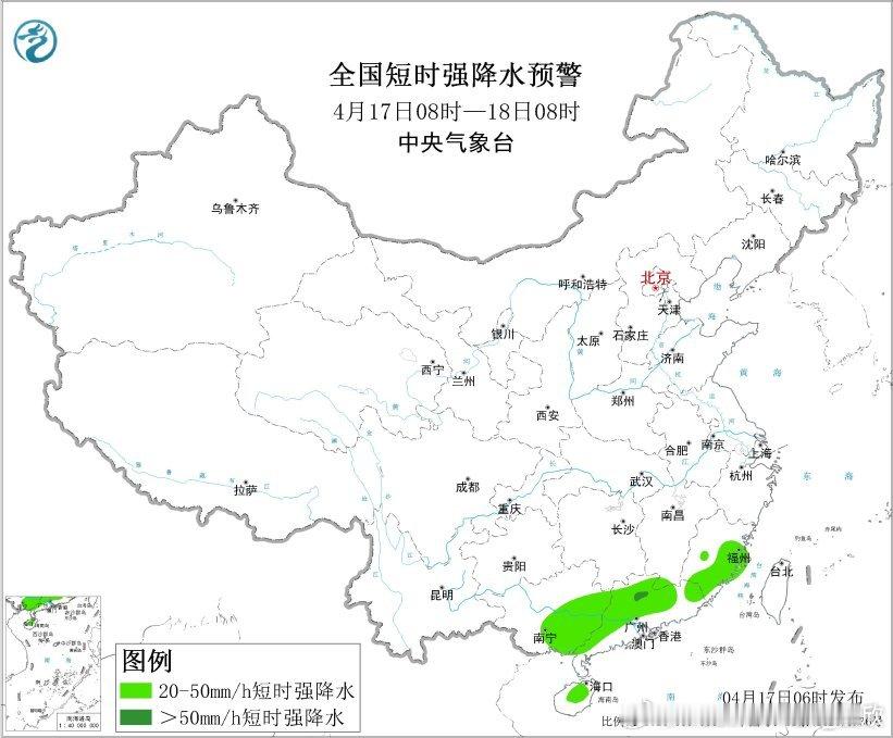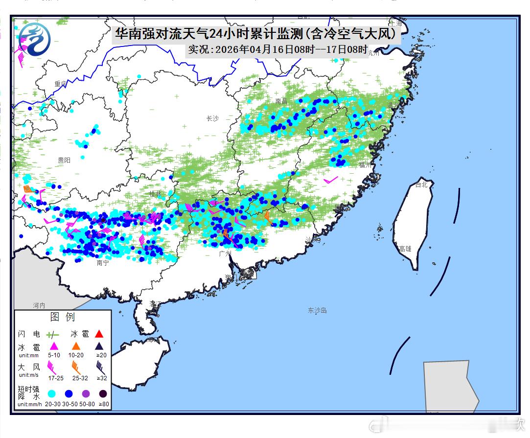 预计4月17日08时至18日08时,华南和东北地区中部等地的部分地区将有8级以上雷暴大风或冰雹天气,其中,广西东南部和广东北部等地的部分地区将有10级以上雷暴大风;华南等地的部分地区将有小时雨量大于20毫米的短时强降水天气,其中,广东北部部分地区小时雨量大于50毫米。