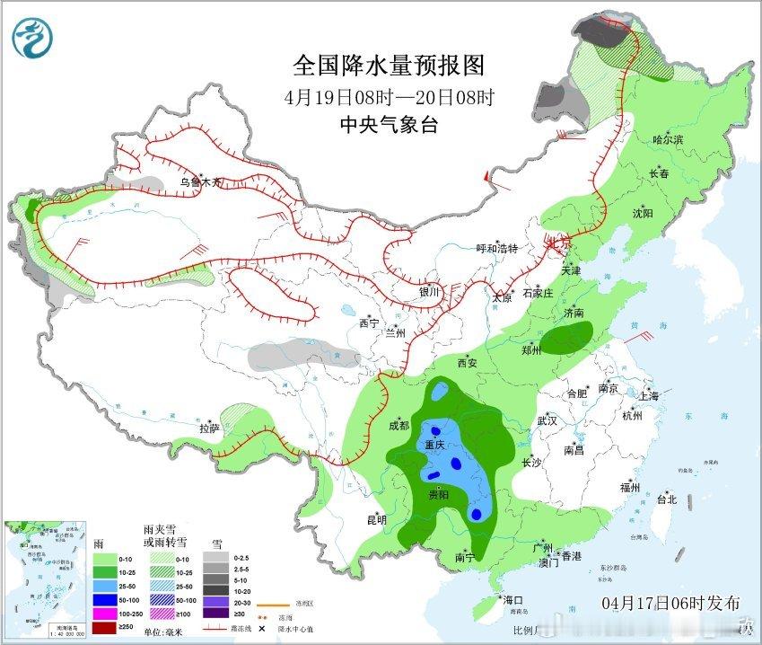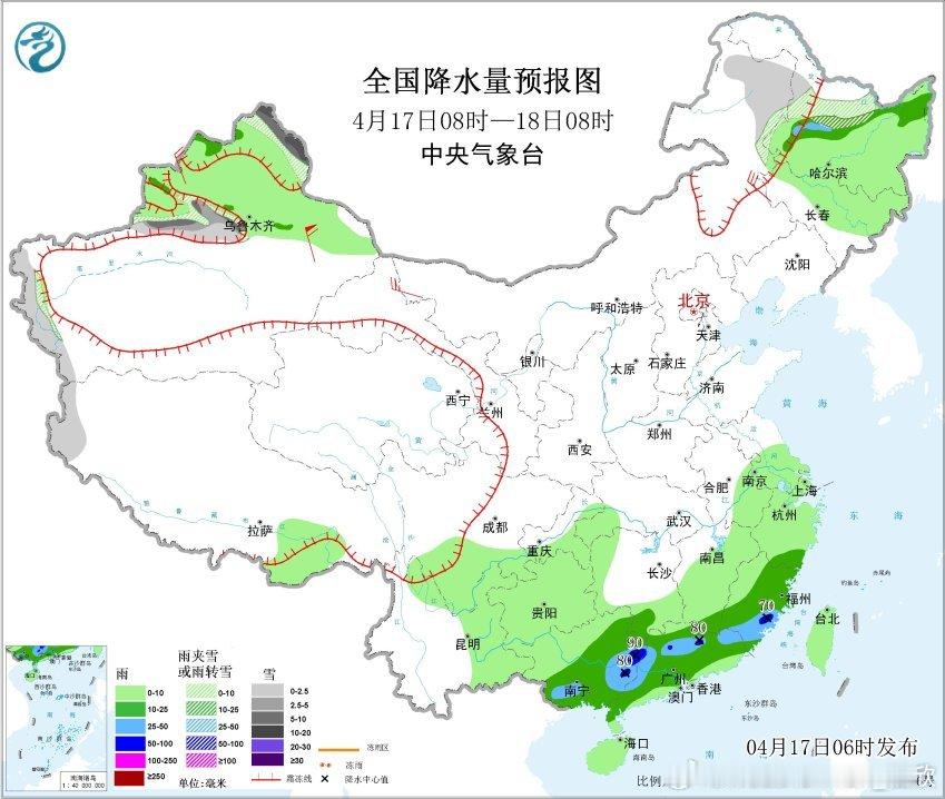 今天低空冷空气继续南下,南方的降雨继续向南转移。华南等地还有强降雨和强对流。今晨中央气象台继续发布了暴雨蓝色和强对流天气蓝色预警:预计,4月17日08时至18日08时,广西东部和南部、广东中北部、福建东南部等地部分地区有大雨,其中,广西东部、广东北部、福建东南部等地部分地区有暴雨(50~90毫米)。