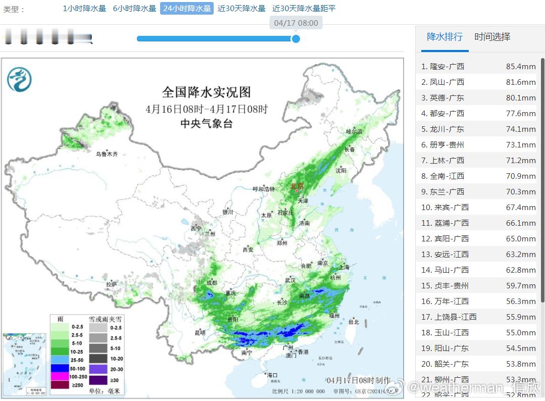 【强降雨和强对流】昨天到今晨,新疆北部、华北到东北,各受到一个高空槽影响,出现降水。西南地区东部、江南、华南因为低空切变线影响,出现大范围对流降雨,多地伴随短时强降雨,局地雷暴大风。贵州广西广东江西部分站点出现暴雨,比如广西隆安85.4毫米、广东英德80.1毫米、贵州册亨73.1毫米、江西全南70.9毫米。