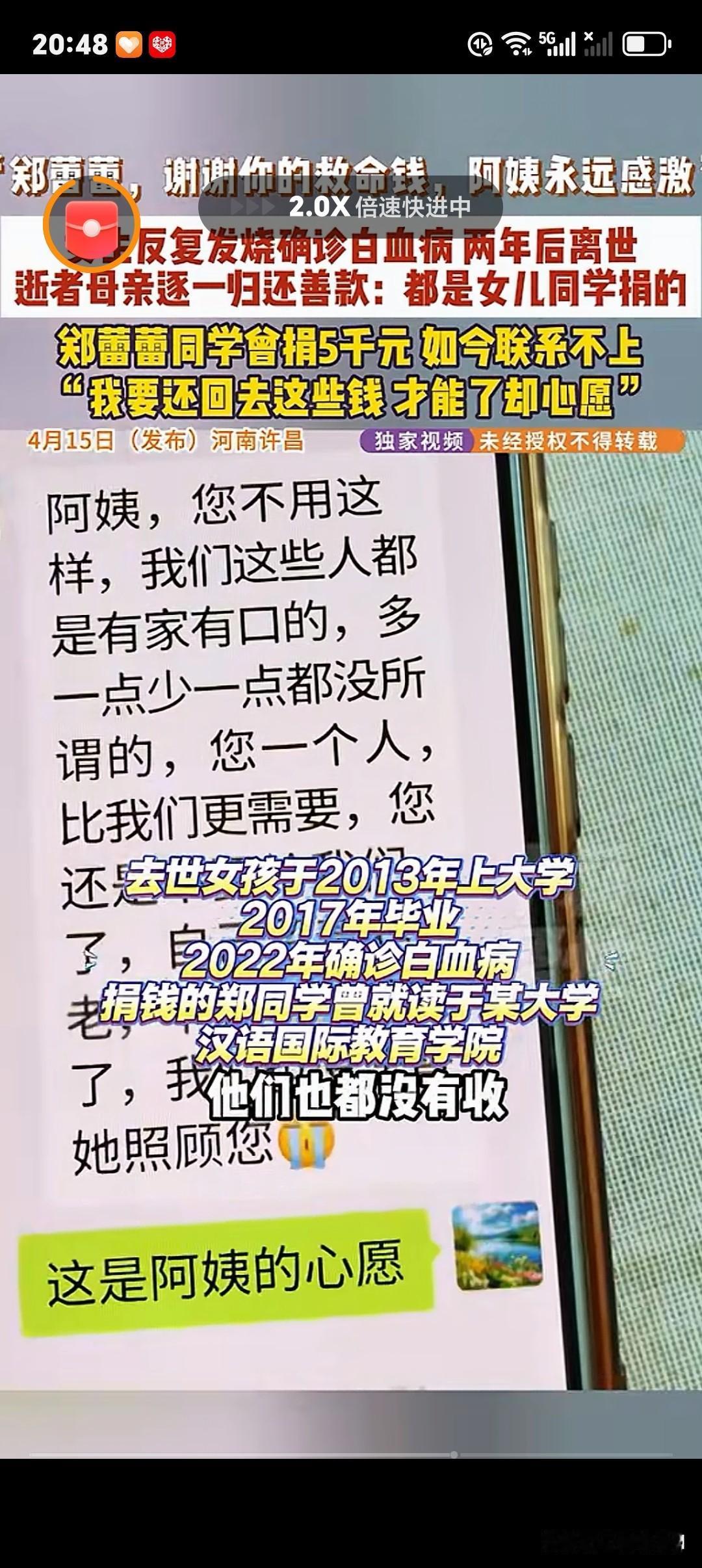 阿姨说女儿同学的帮助,她非常感激,这份恩情永远忘不了。现在她想把同学们的善款都还回去,有联系方式的同学,她都还回去了,但是那些同学们也都没有收。