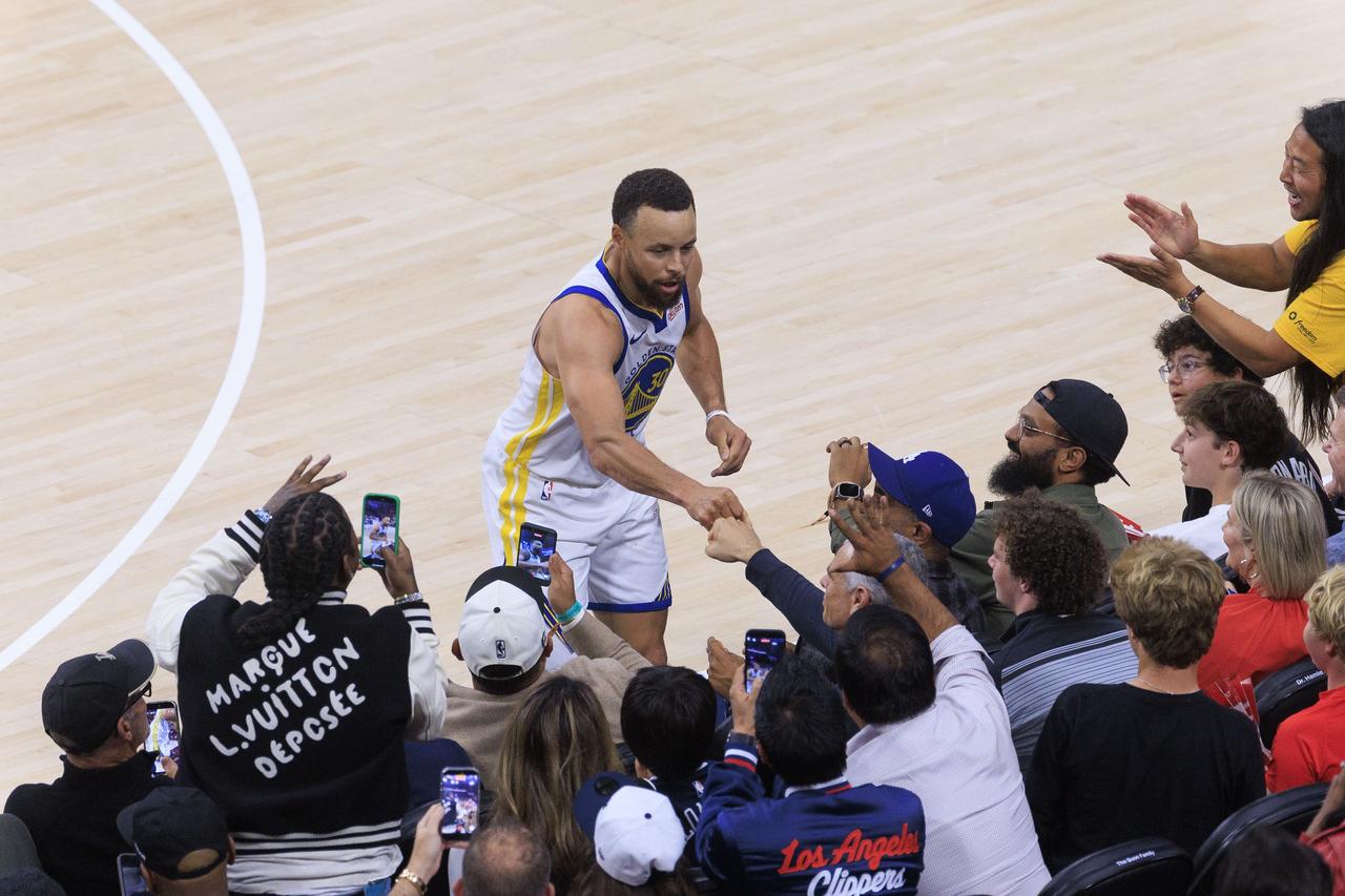 篮球NBA场边花絮:杀人诛心呀!库里命中绝命三分后同场边快船球迷互动,险些崴脚快
