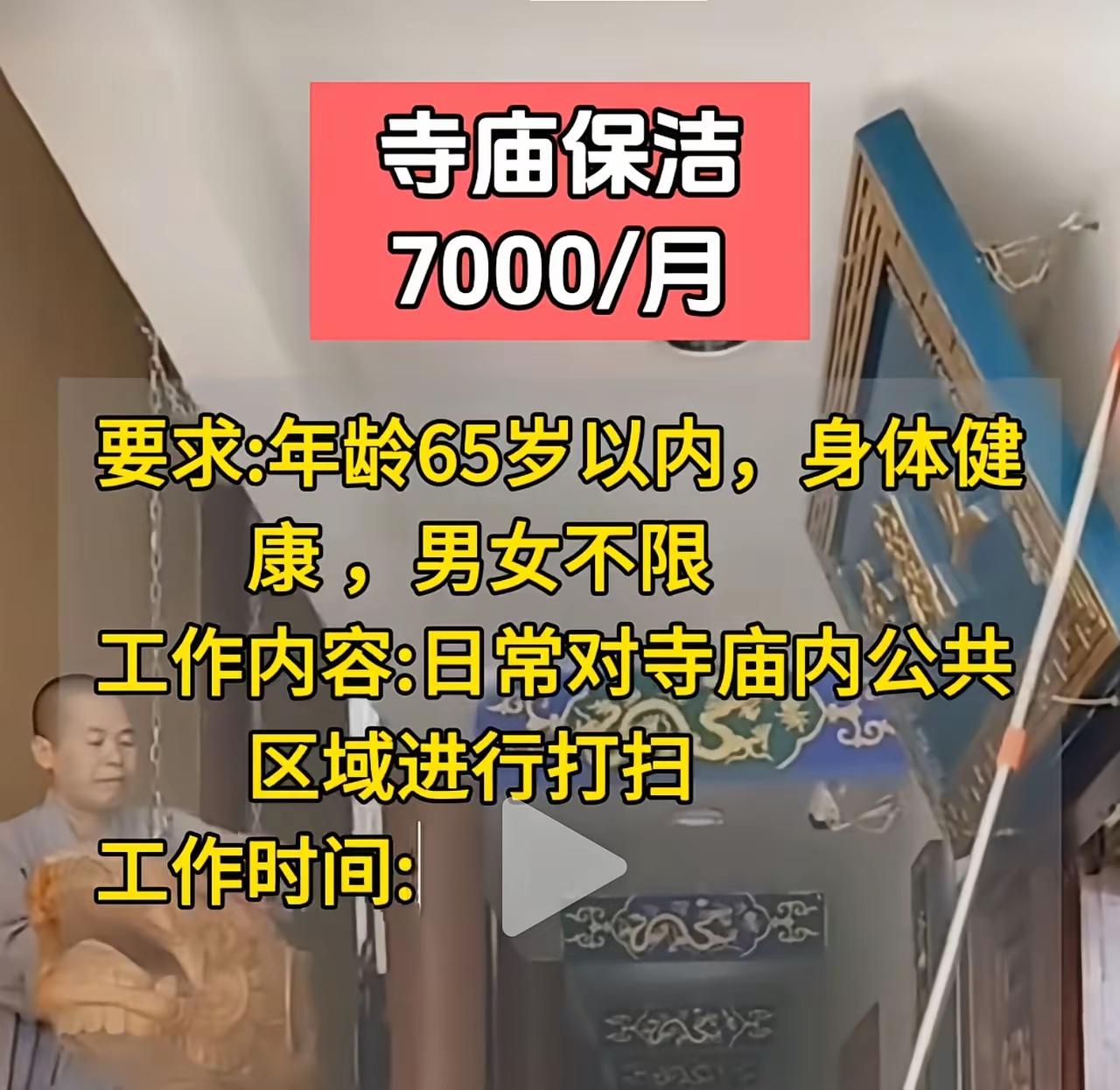 和尚不是自己干活吗?怎么还安排上洗脚的了?还高薪招聘保洁!这待遇直接碾压众生呀! 印象里的僧人,都是晨钟暮鼓,洒扫庭除,自给自足,劈柴挑水样样来,怎么现在这么“排场”了?这待遇让人着实羡慕呀!这还是清修吗?