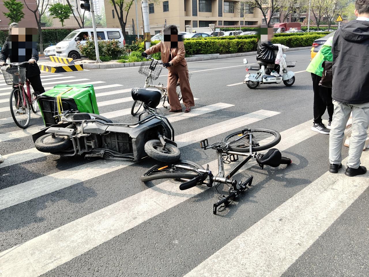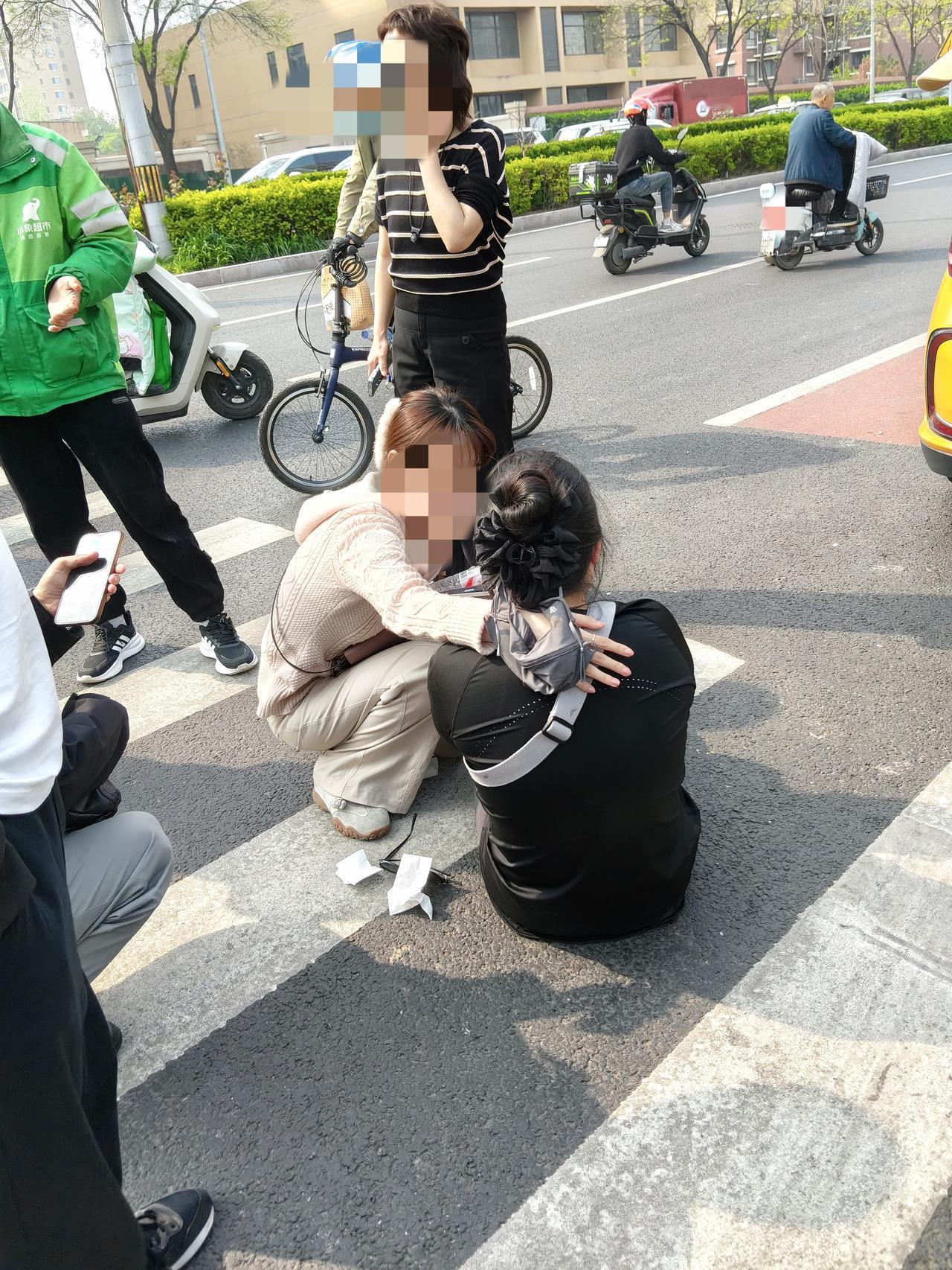 今天下午,307医院门口发生了一起交通事故。一名美团小象超市的配送员与一位骑自行车的年轻女士相撞,女士坐在地上,脸上有伤在流血,被吓的止不住地哭泣。身旁有位女孩一直蹲在地上,轻声安抚着她,场面让人揪心,等着交警来处理。只愿伤者无大碍,出行路上多一份谨慎,少一分意外。