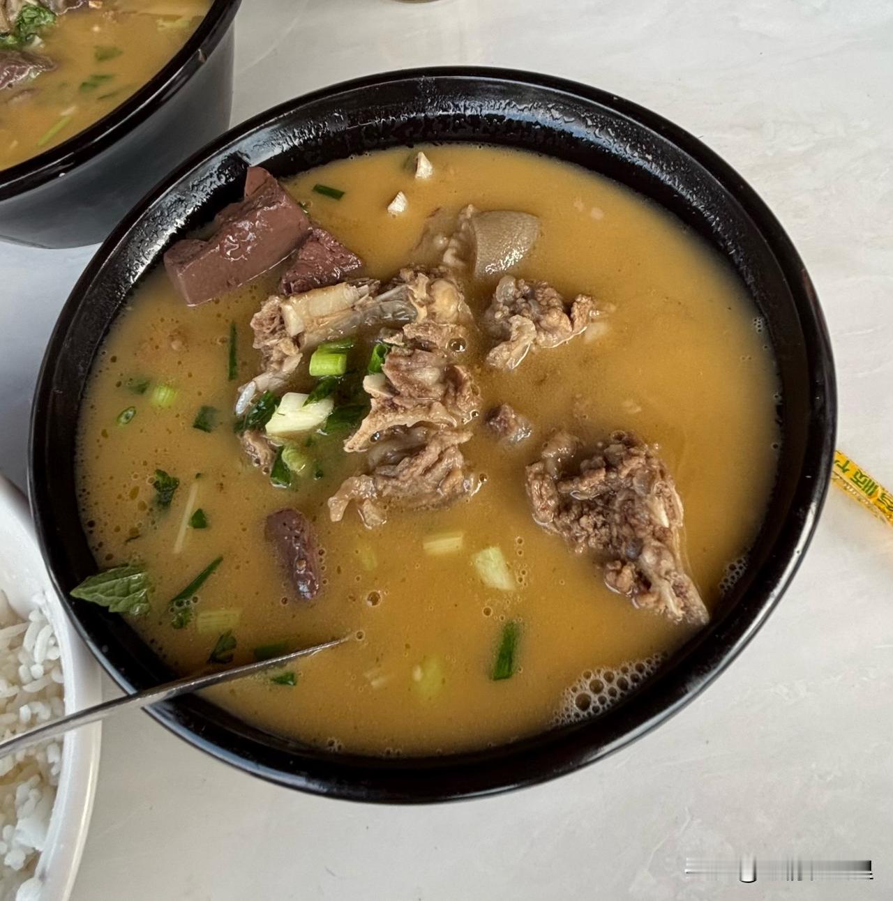 盛菜的容器是小砂锅,肉吃起来有点艮,但是能嚼动。翻一翻下面有薄荷叶,还有草果一样大小的焯料。喝一口汤,酸辣味加薄荷和佐料的复合味,特别鲜。