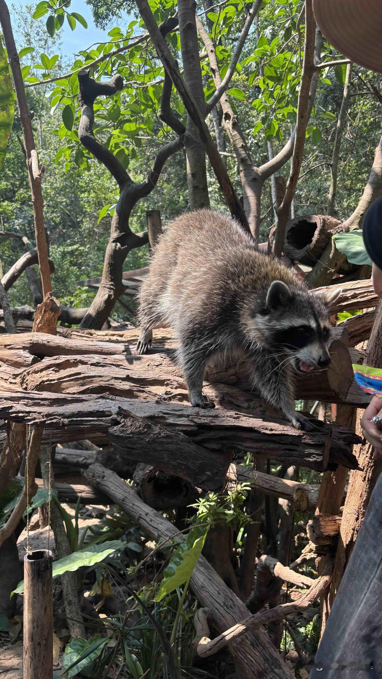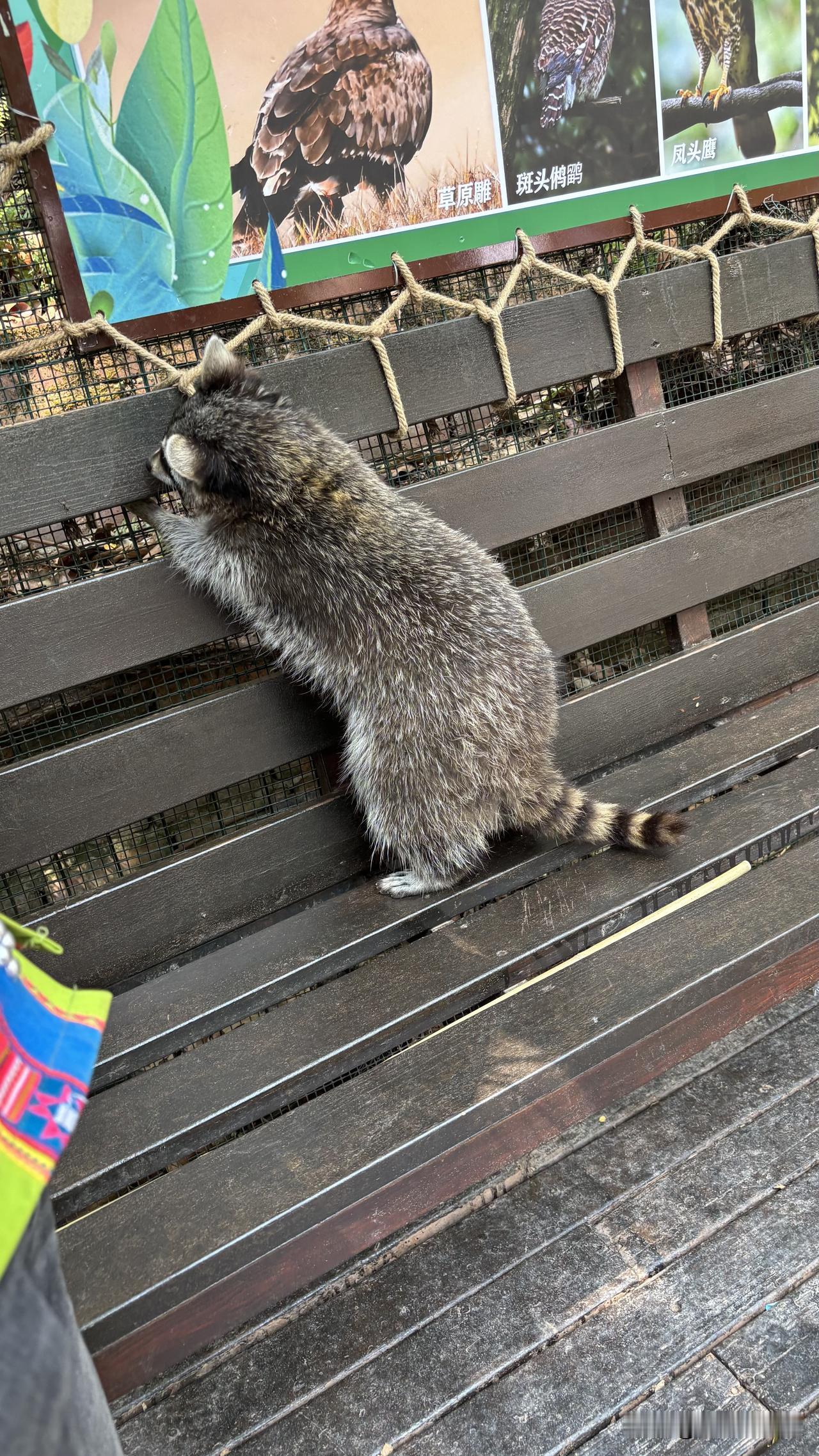 那天我去的时候接近中午了,小浣熊缠着饲养员,漂亮的女饲养员马上抱走它,说它困了,该睡午觉了。