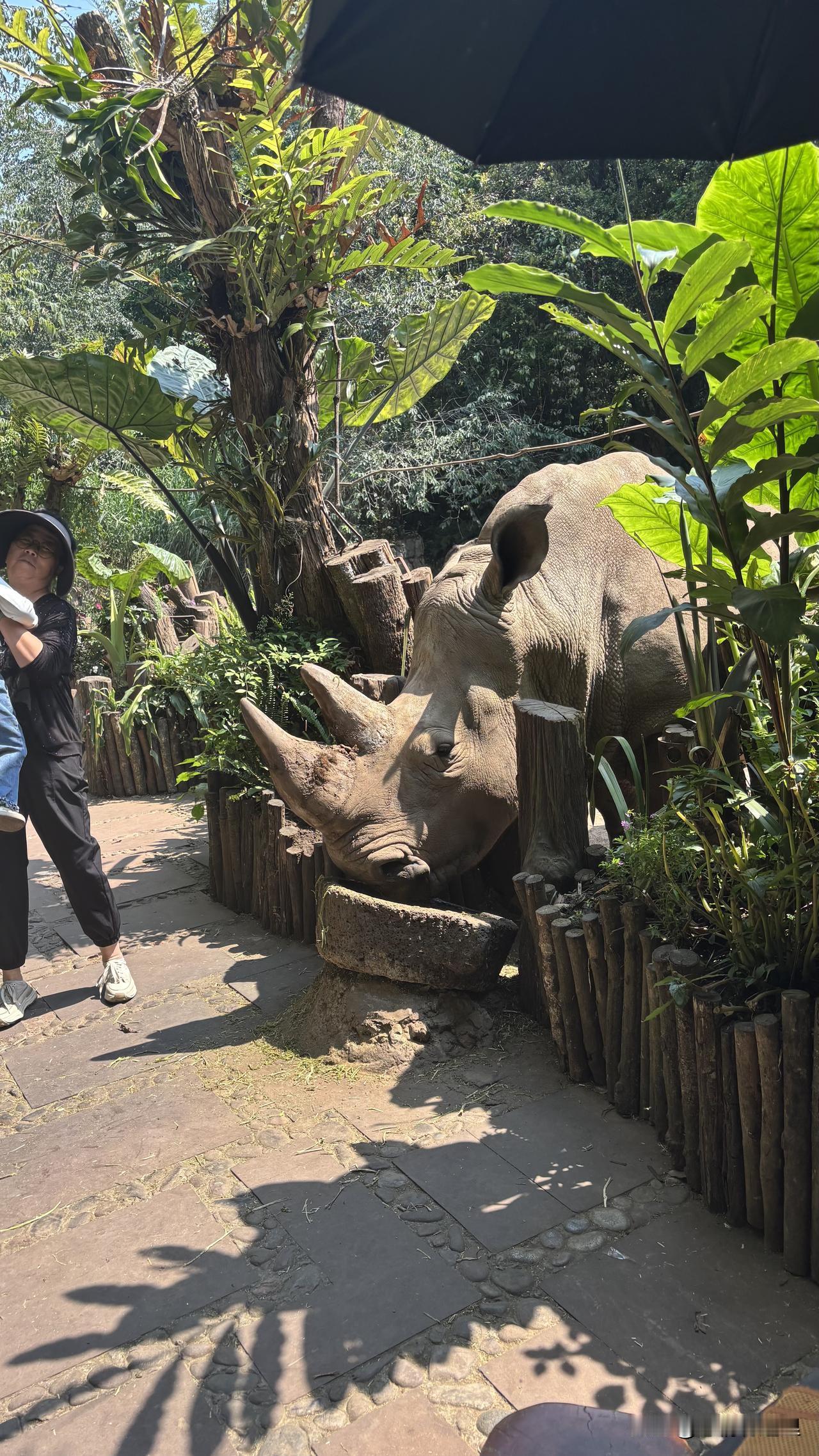 像堪比大象体积的犀牛最受游客地关注,公园设了一个专门互动的地点,游客花二十元钱可以抚摸犀牛并和它合影。
