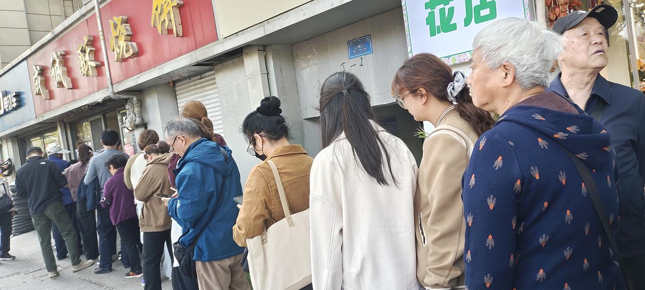 人潮汹涌,排队只为尝一口成城酥烧饼!秀云妹为让同行的朋友们尝一下自己家乡南京名酥烧饼,排队近一个小时,如愿买了三十个。脸上露出开心的笑容