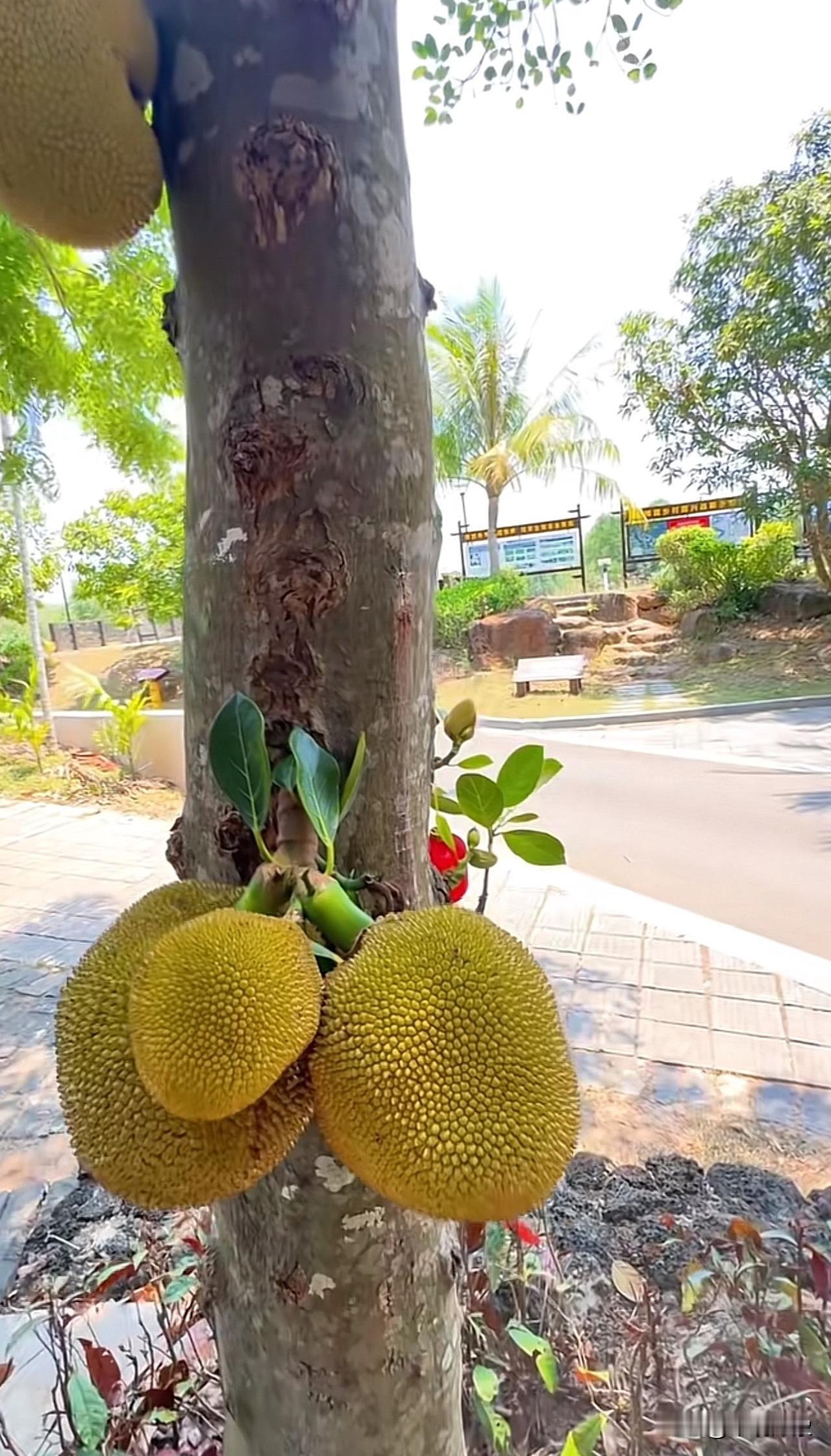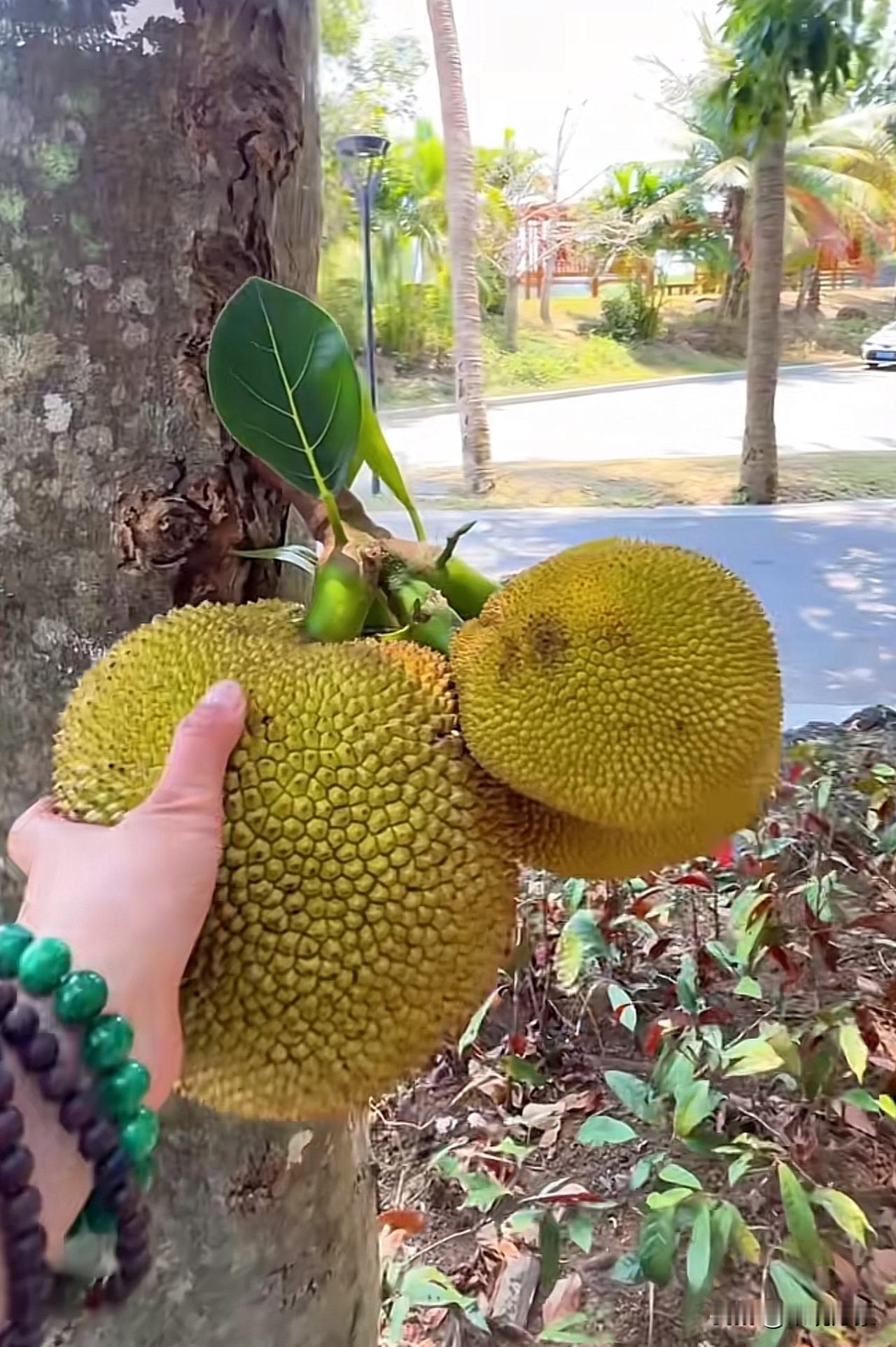 海南美丽乡村的道路旁,随处可见沉甸甸挂在枝头上的老树菠萝蜜,触手可及的香甜满是乡