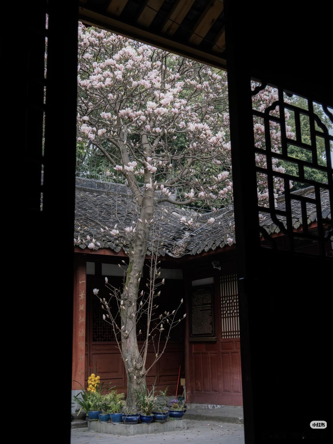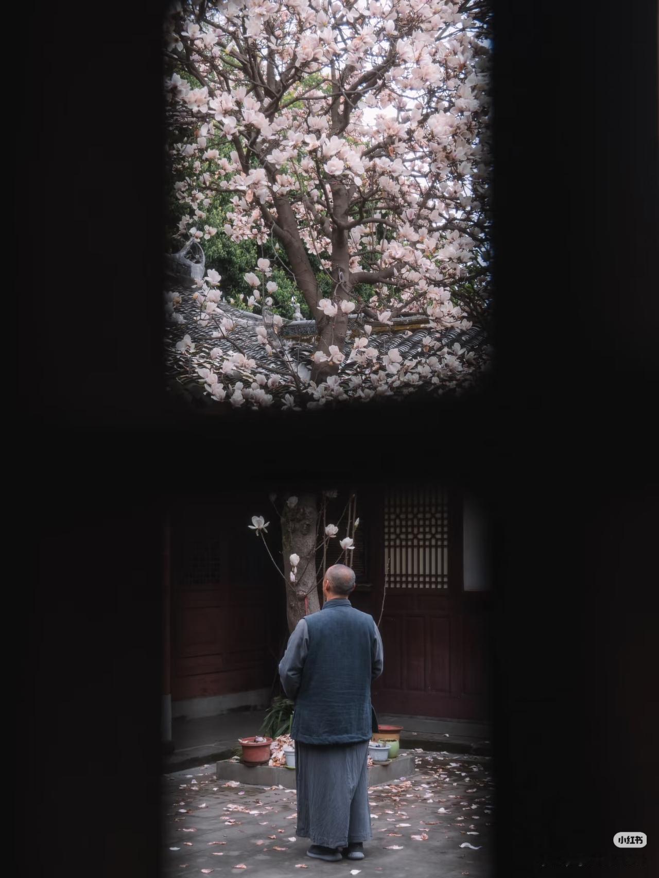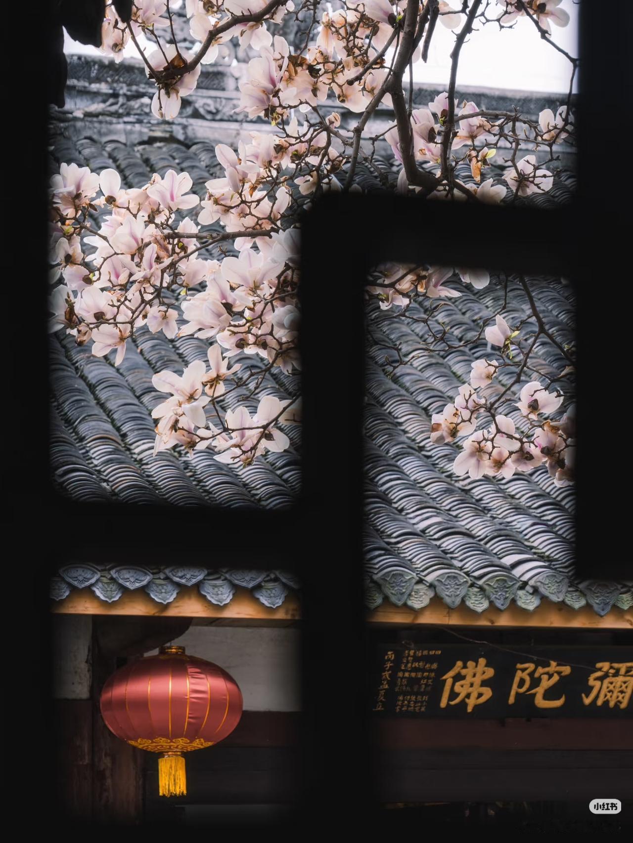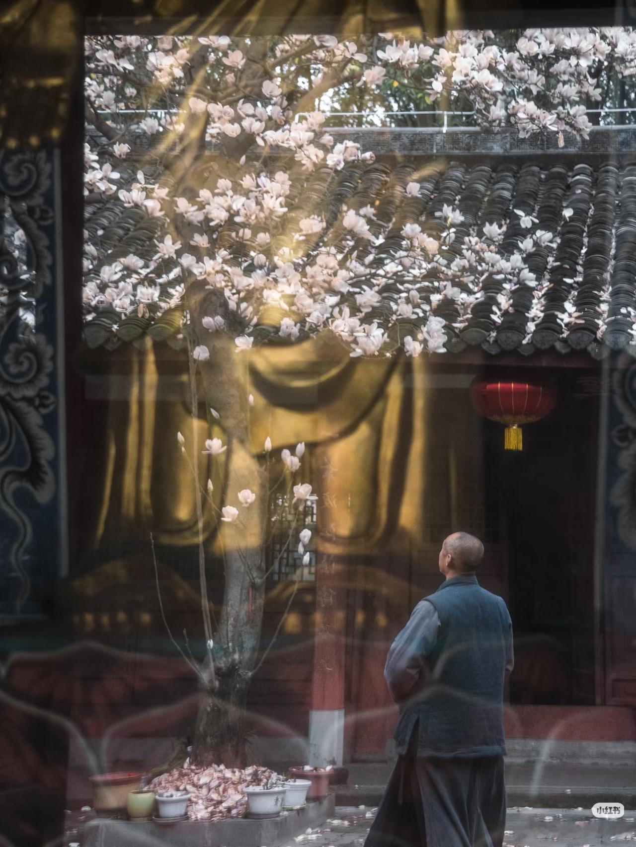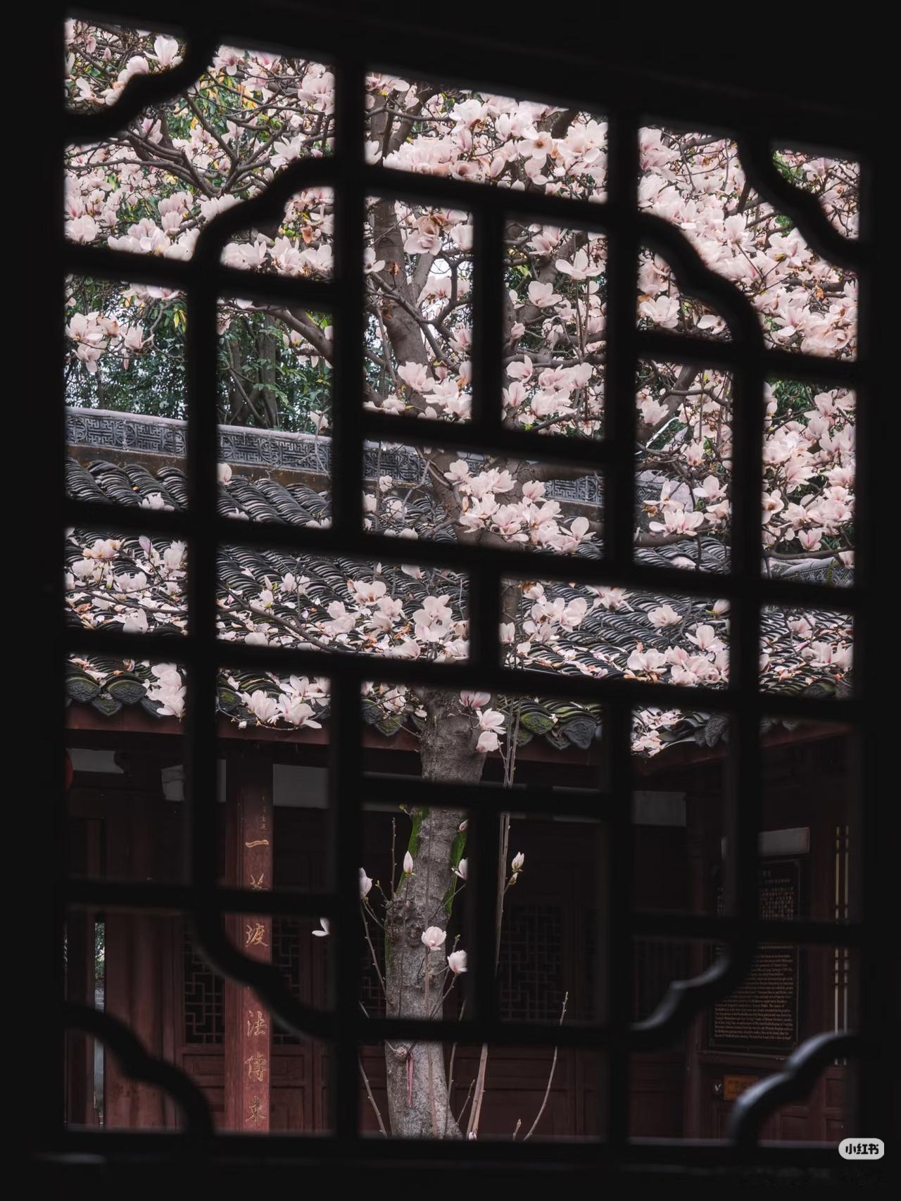 当玉兰花在寺庙中绽放,寺庙的门窗就成了一幅幅画框,似乎每个角度都透露着中式浪漫。