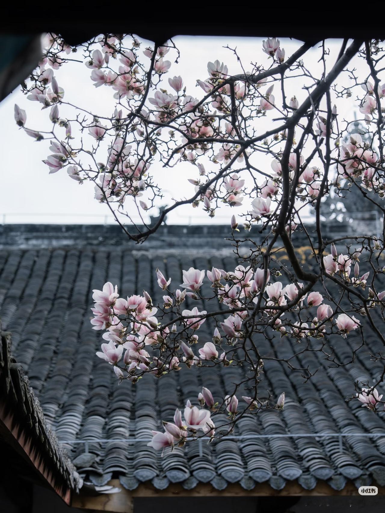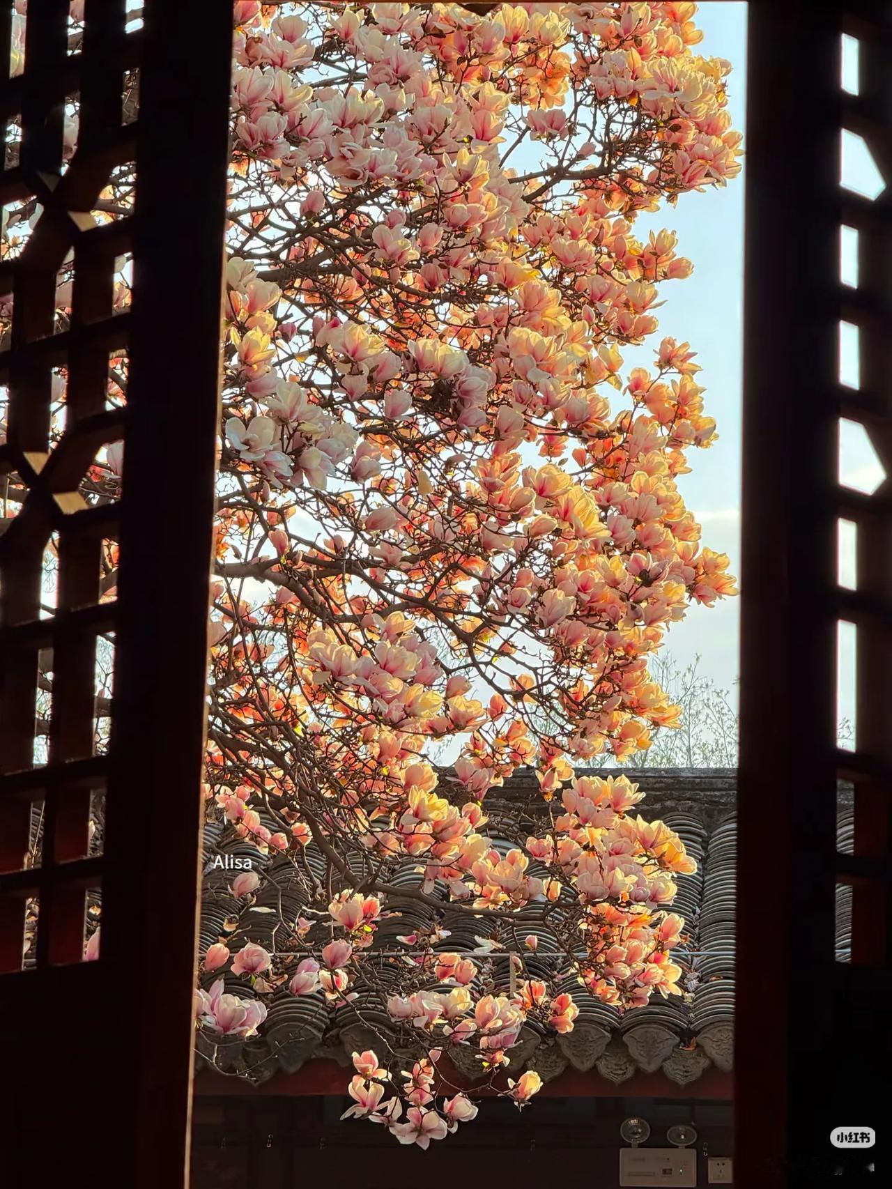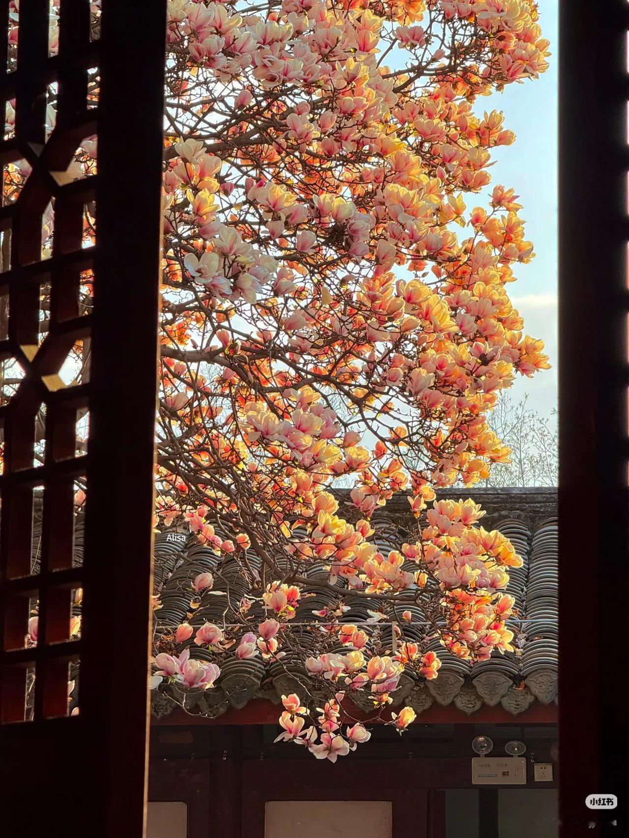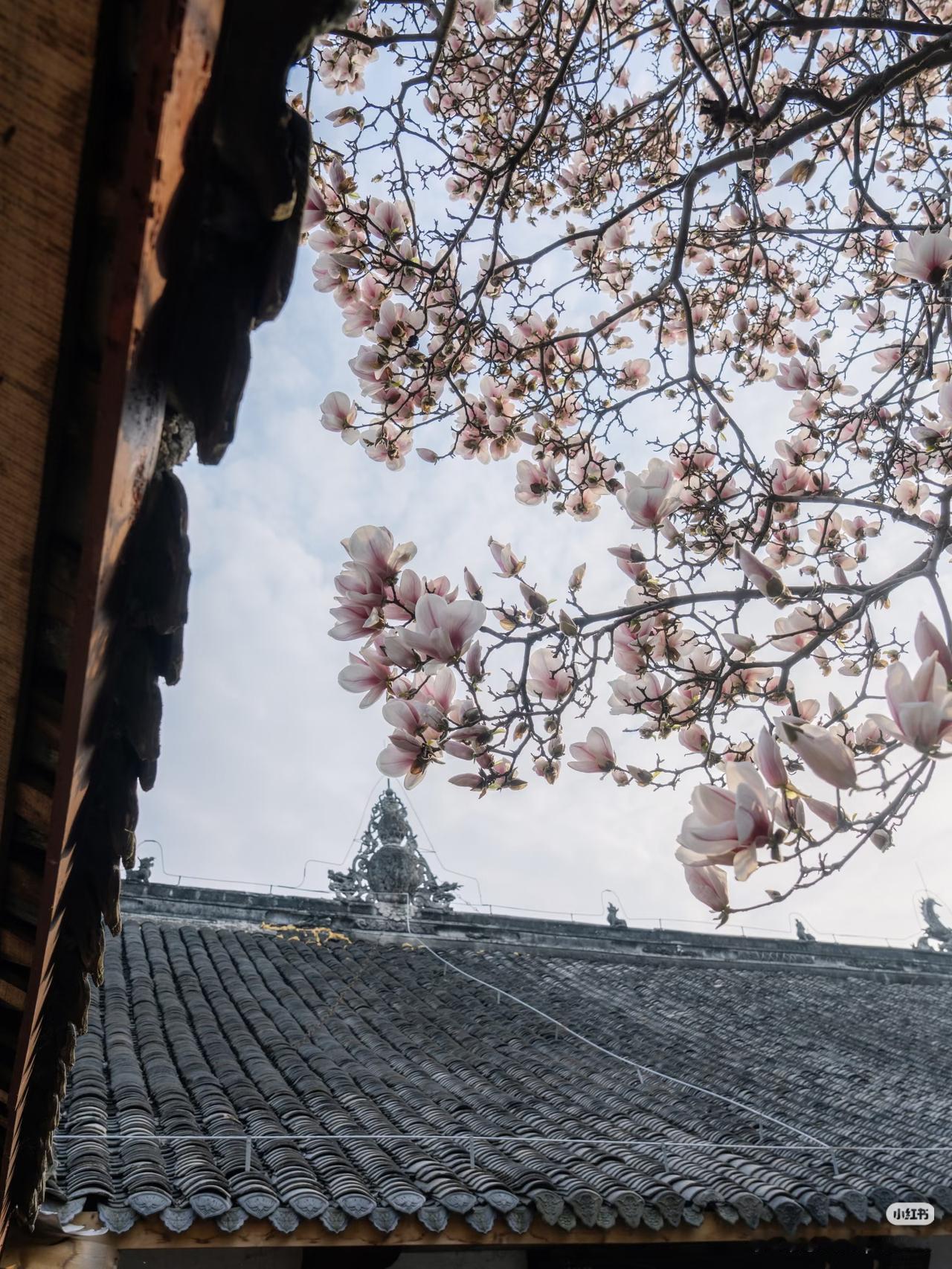 当玉兰花在寺庙中绽放,寺庙的门窗就成了一幅幅画框,似乎每个角度都透露着中式浪漫。