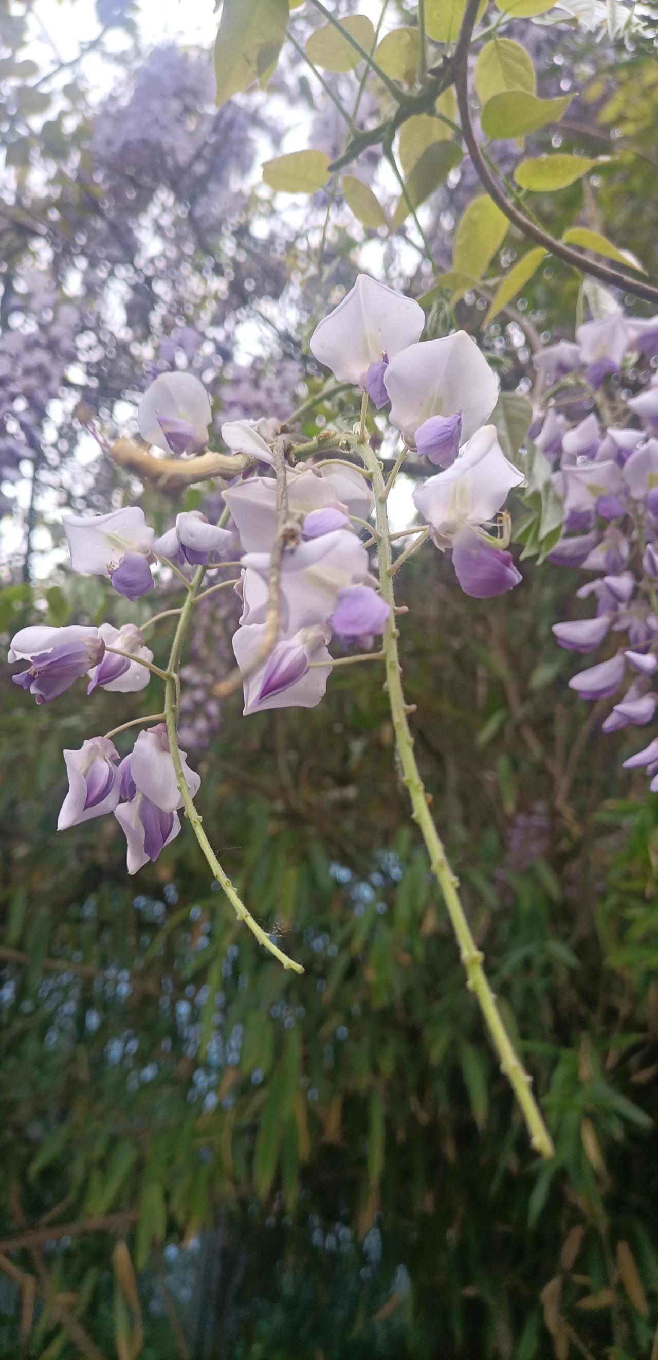 紫藤花,正值盛花期,一串串紫白相间的蝶形花垂挂在枝条上,搭配翠绿羽状复叶,清新雅致。