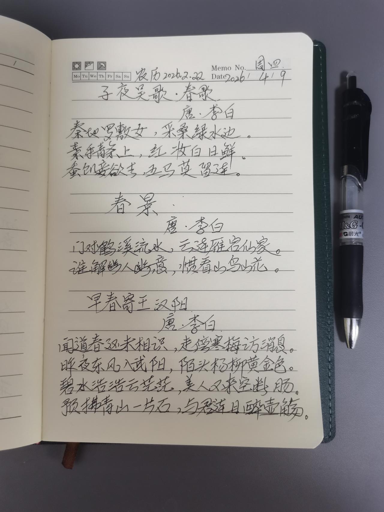 每日抄书打卡。喜欢李白的两句诗:天生我才必有用,千金散尽还复来。自卑时第一句映入眼帘,笃定自己大器晚成,不敢妄自菲薄,努力前进,前进,进;经济上投资失败,吃亏上当被骗时,用第二句来劝慰自己,风水轮流转,今天到我家。好了,抄书打卡第422天,昨天收益0.02,一直在挣钱,自己好好棒。