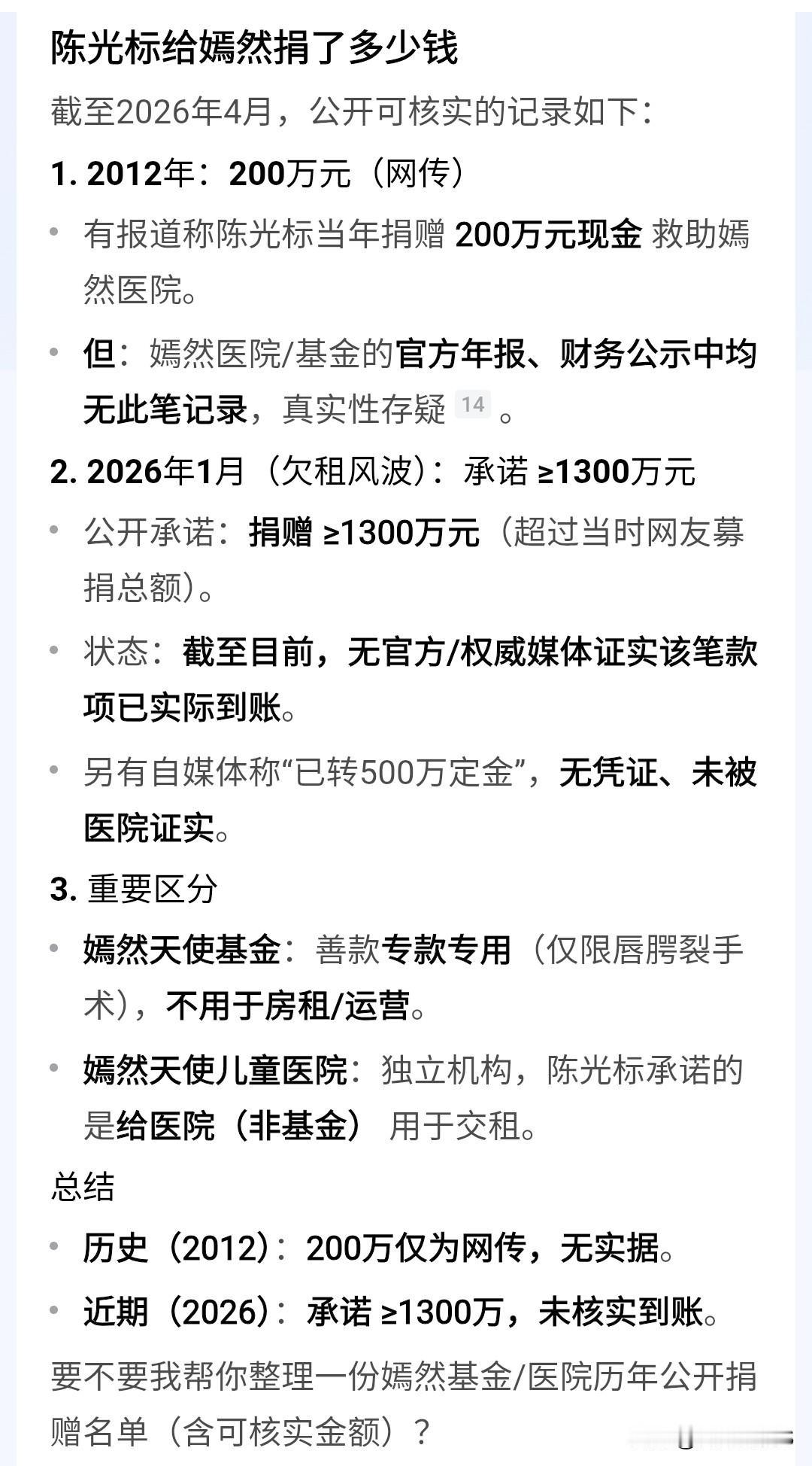 最近一次是2026年的承诺向嫣然基金捐款≧1300万的基金也核实未到账。