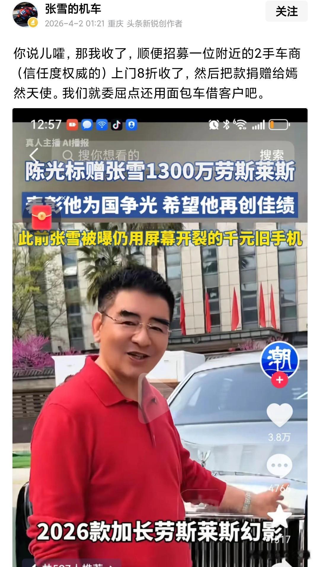 起因中国大善人陈光标4月1日发视频称要送给张雪价值1300万2026款新买的加长版劳斯莱斯,表彰他为国争光,称他为中国英雄。