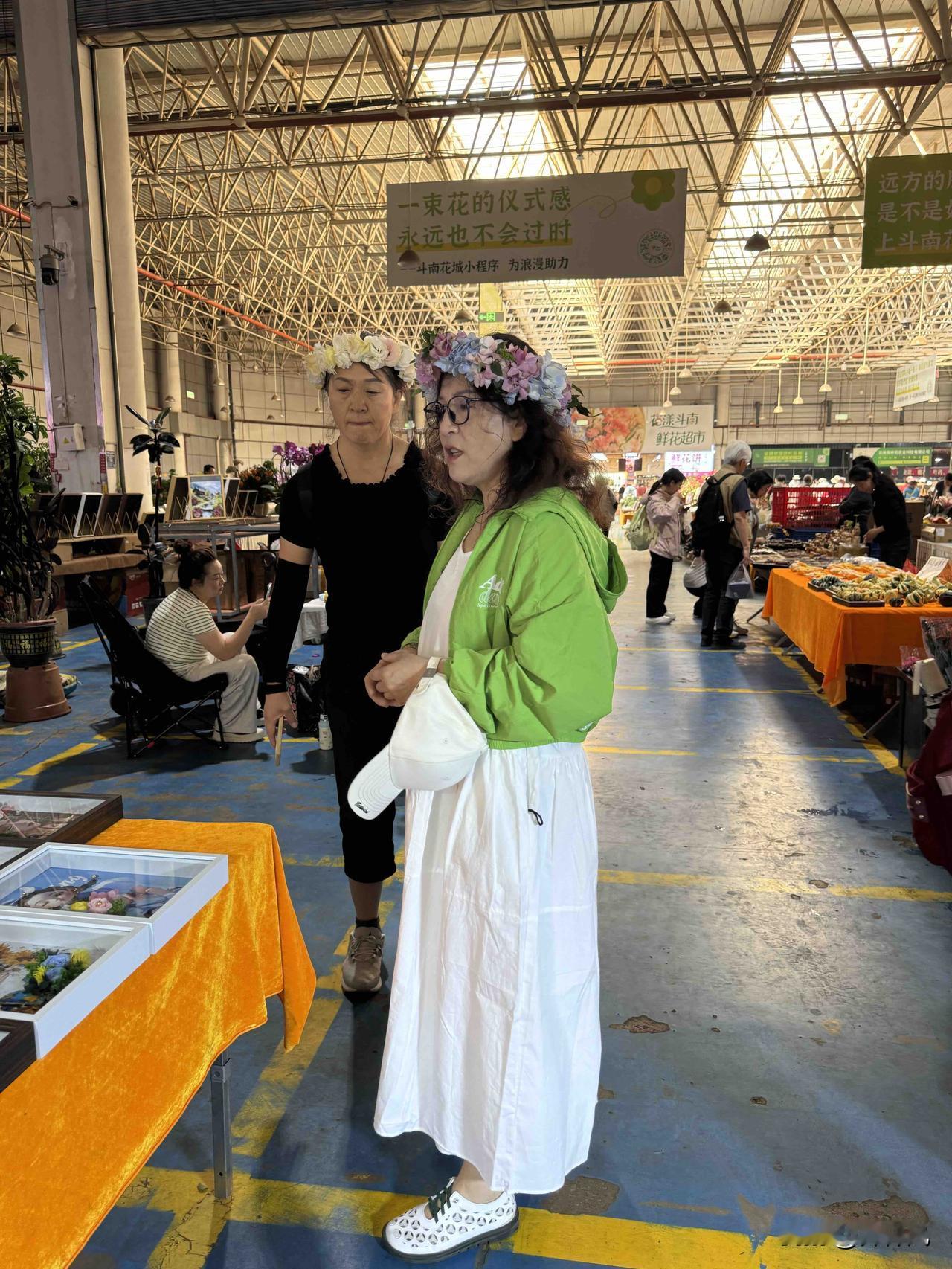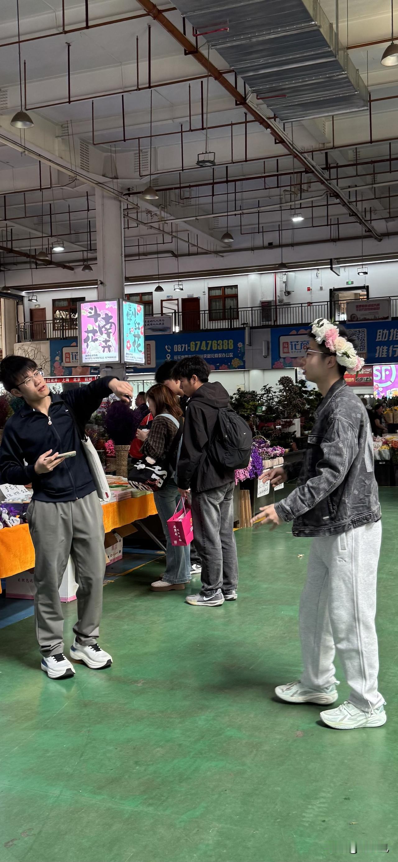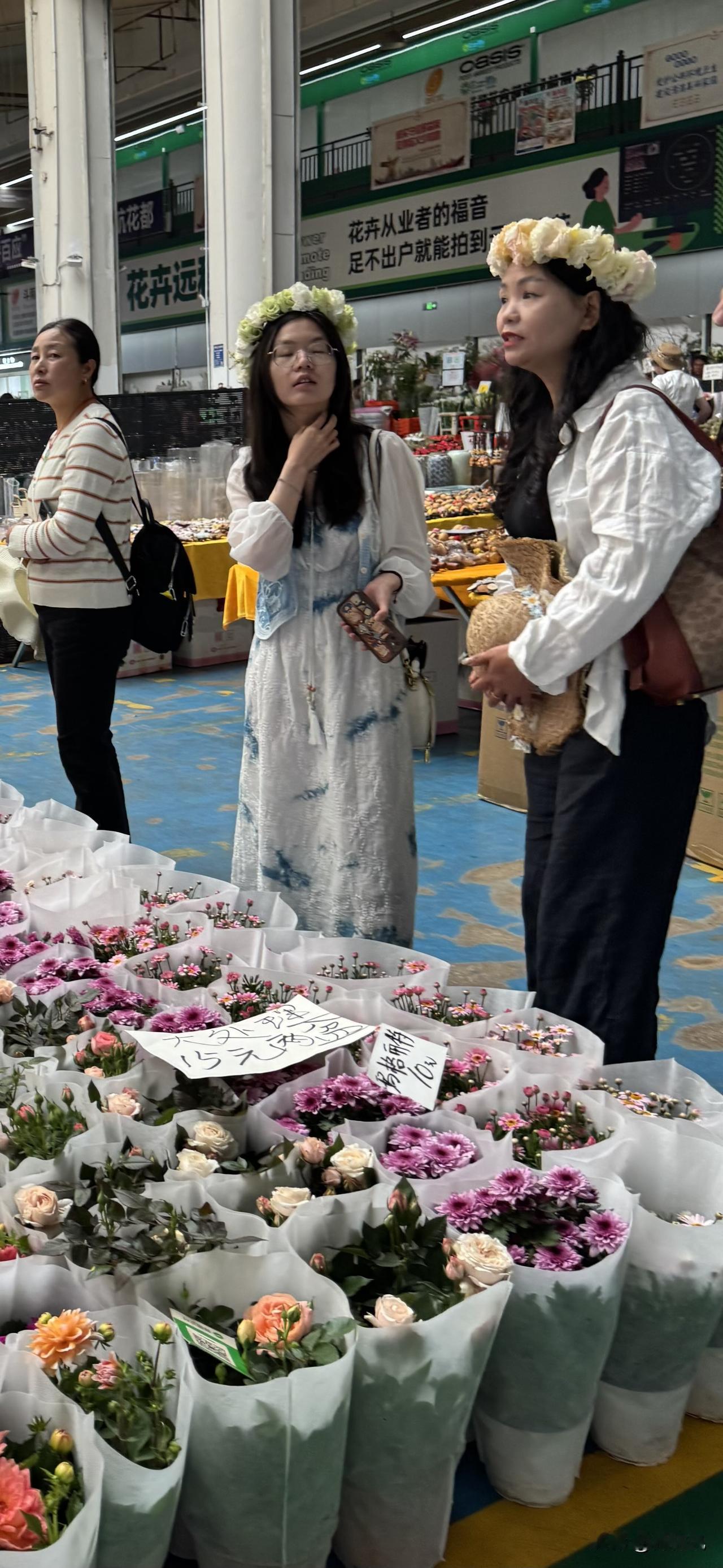 在斗南花市花4元买一个花环,戴在头上应个景,男孩也有戴花环拍照打卡的。