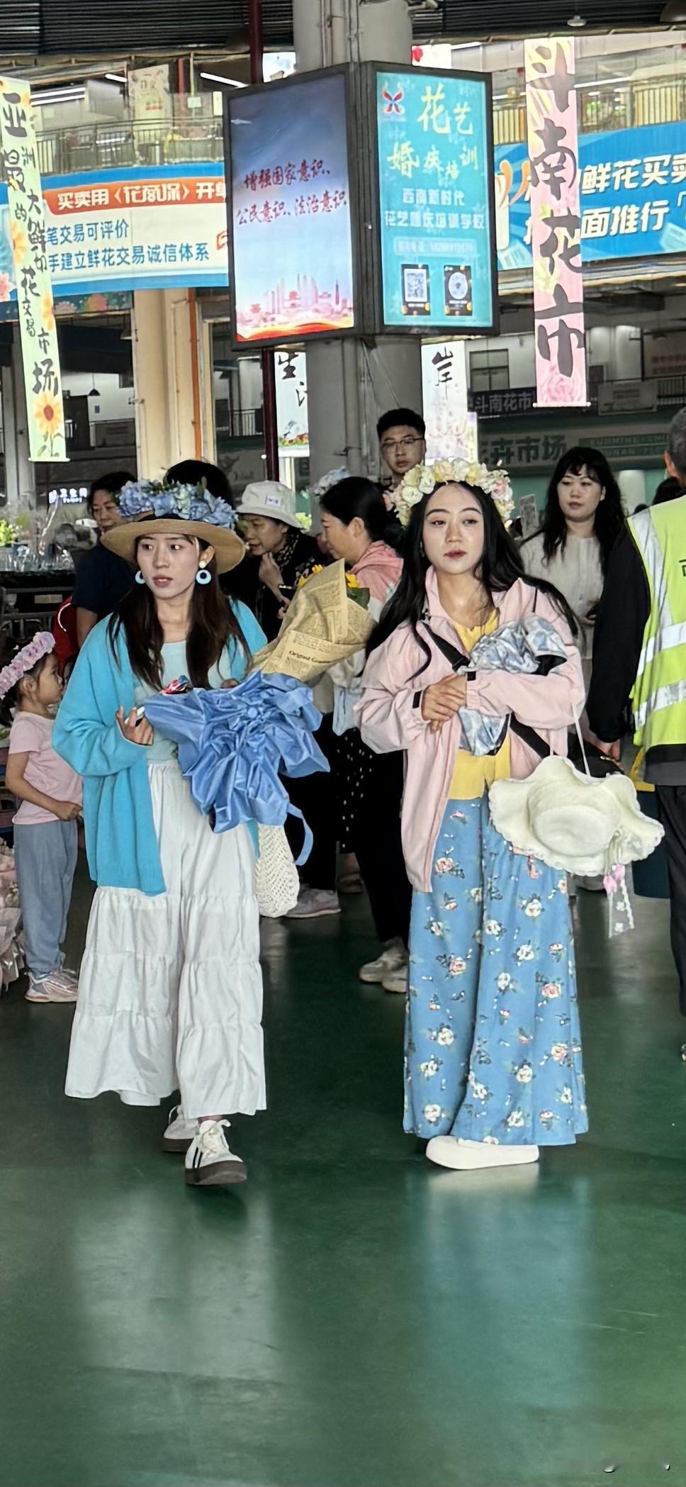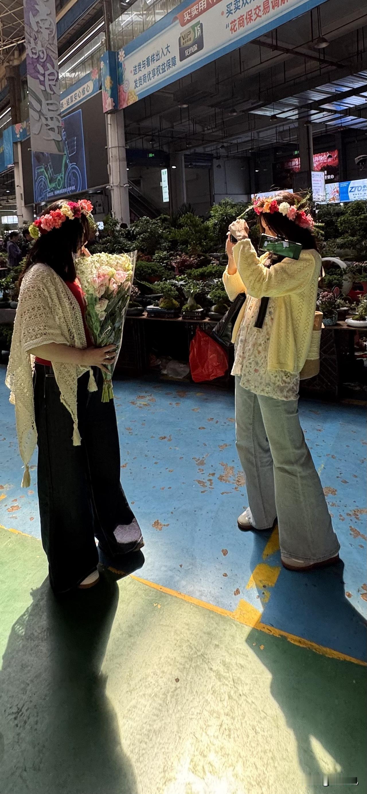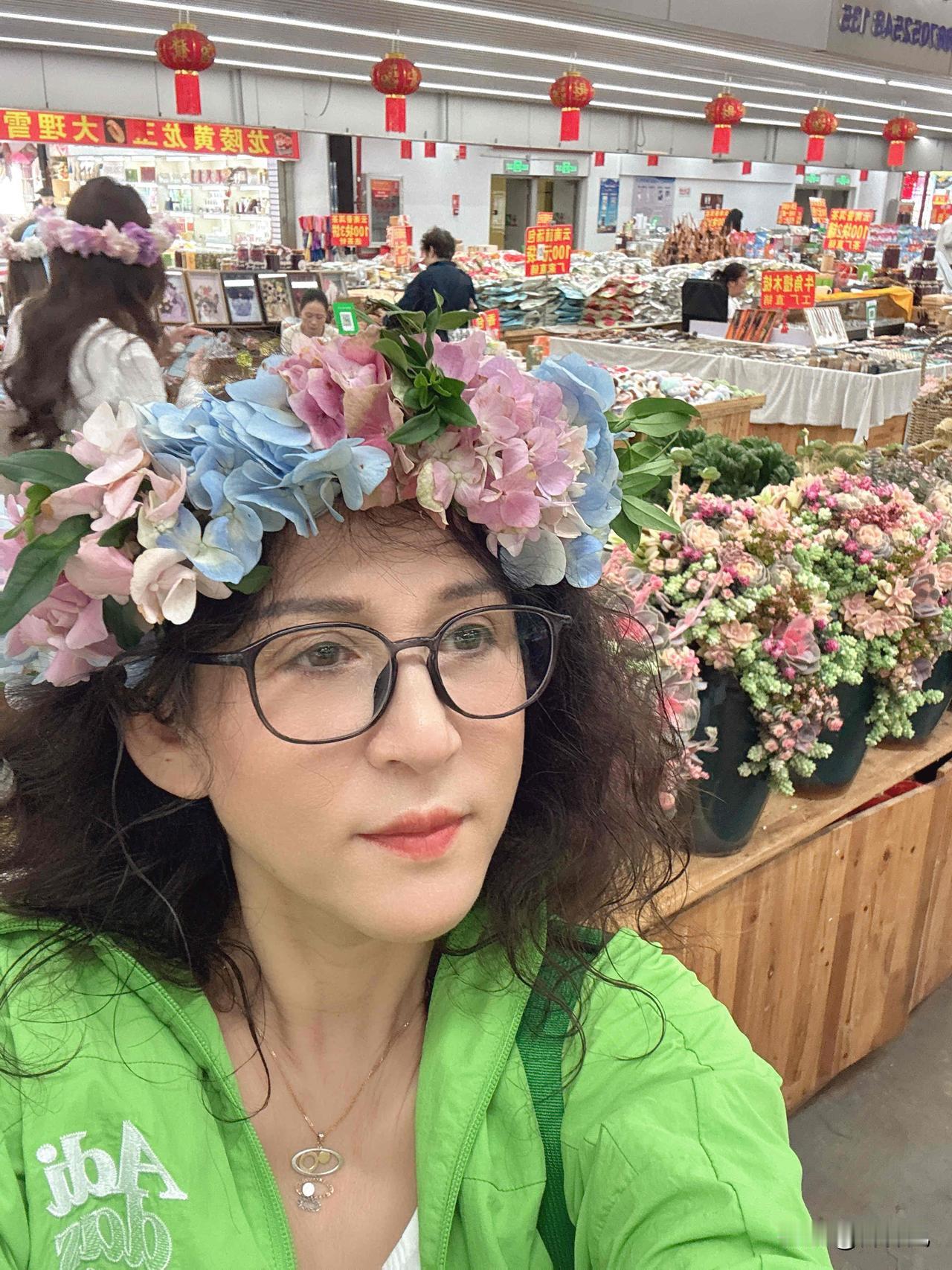在斗南花市花4元买一个花环,戴在头上应个景,男孩也有戴花环拍照打卡的。