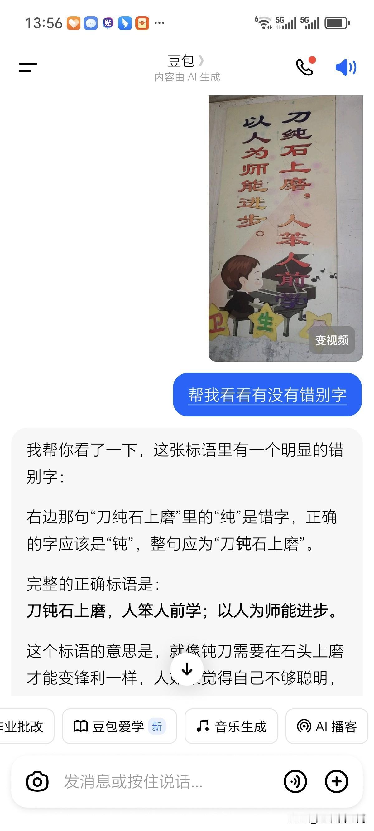 今天看到一个励志的文化标语,我估计有一个错别字,直接问豆包,猜猜豆包厉害不?
