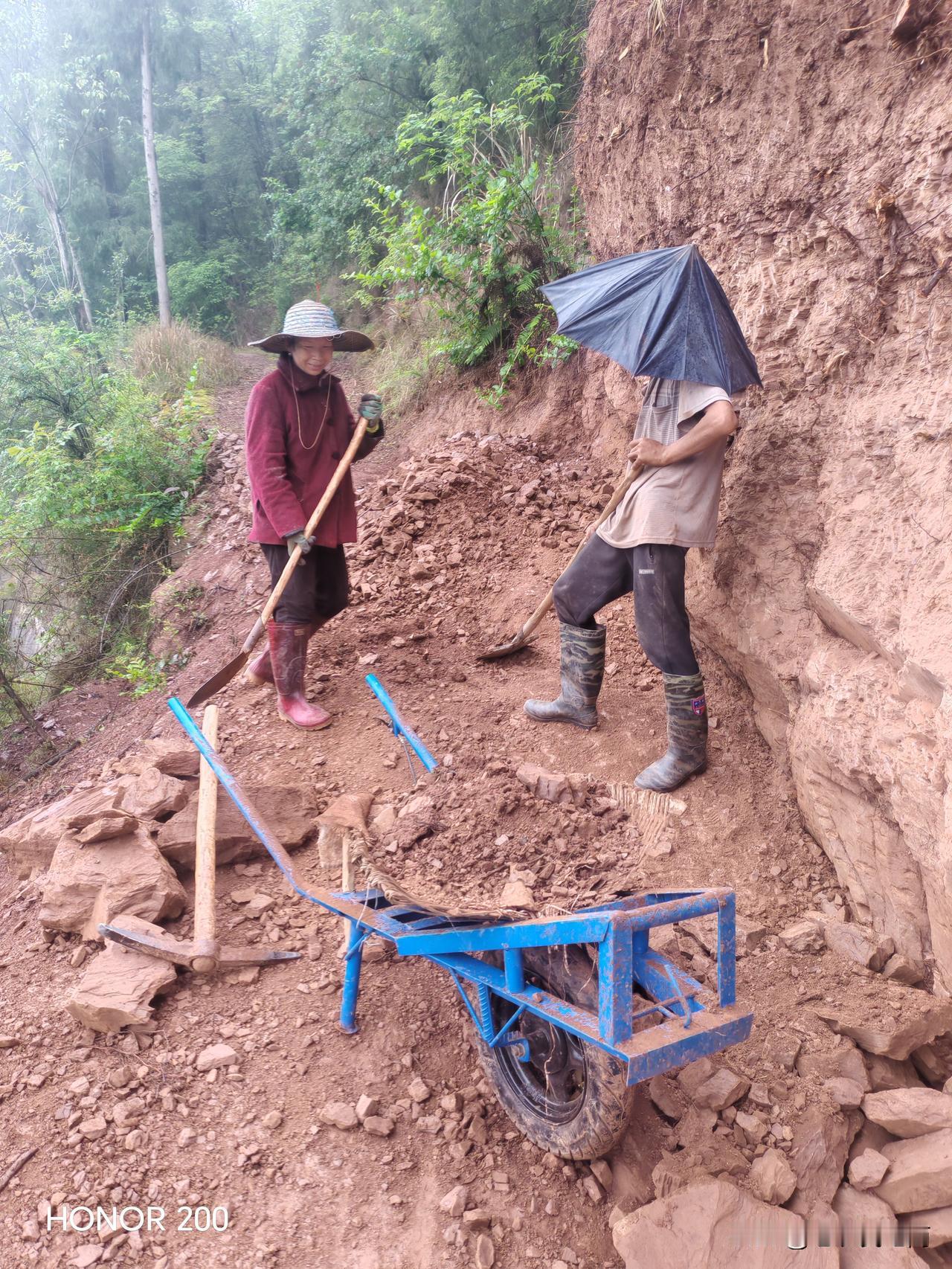 这条路从去年腊月就开始修了,冬天寒风刺骨,山里的路格外湿滑。杨华平看在眼里,急在心里,村里种粮食的路坑坑洼洼,乡亲们挑肥运粮一不小心就容易滑倒。“路不好走,大家种粮、出行都太遭罪了,我得想办法修一修。”这个念头一旦生根,便再也挥之不去,在他的意念中一定要把这条路修好,我听杨华平七十多岁的母亲说,杨华平白天晚上都在念着修这条路。没有机械,他就靠最原始的工具——一把锄头、一柄圆锹、一根钢钎,开启了漫长的修路之路。天刚蒙蒙亮,他就扛着工具出门,踩着寒霜上路;一直干到夜幕降临,才拖着疲惫的身子回家,手上磨出了血泡,血泡破了又结出厚厚的茧,肩膀被工具压得红肿疼痛,他却从未喊过一声苦。