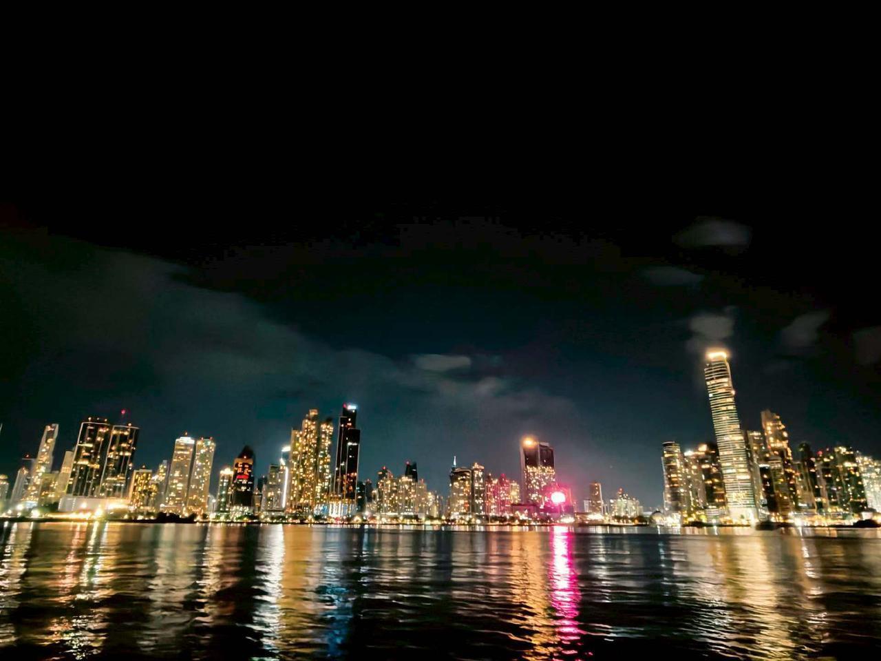 晒图笔记大赛多座现代化高楼林立,其中一座高耸的摩天大楼尤为醒目,顶部亮着暖黄色灯光。建筑群灯火通明,倒映在平静的水面上,形成绚丽的光影效果。深蓝色的夜空中点缀着几朵云彩,整体氛围宁静而繁华。