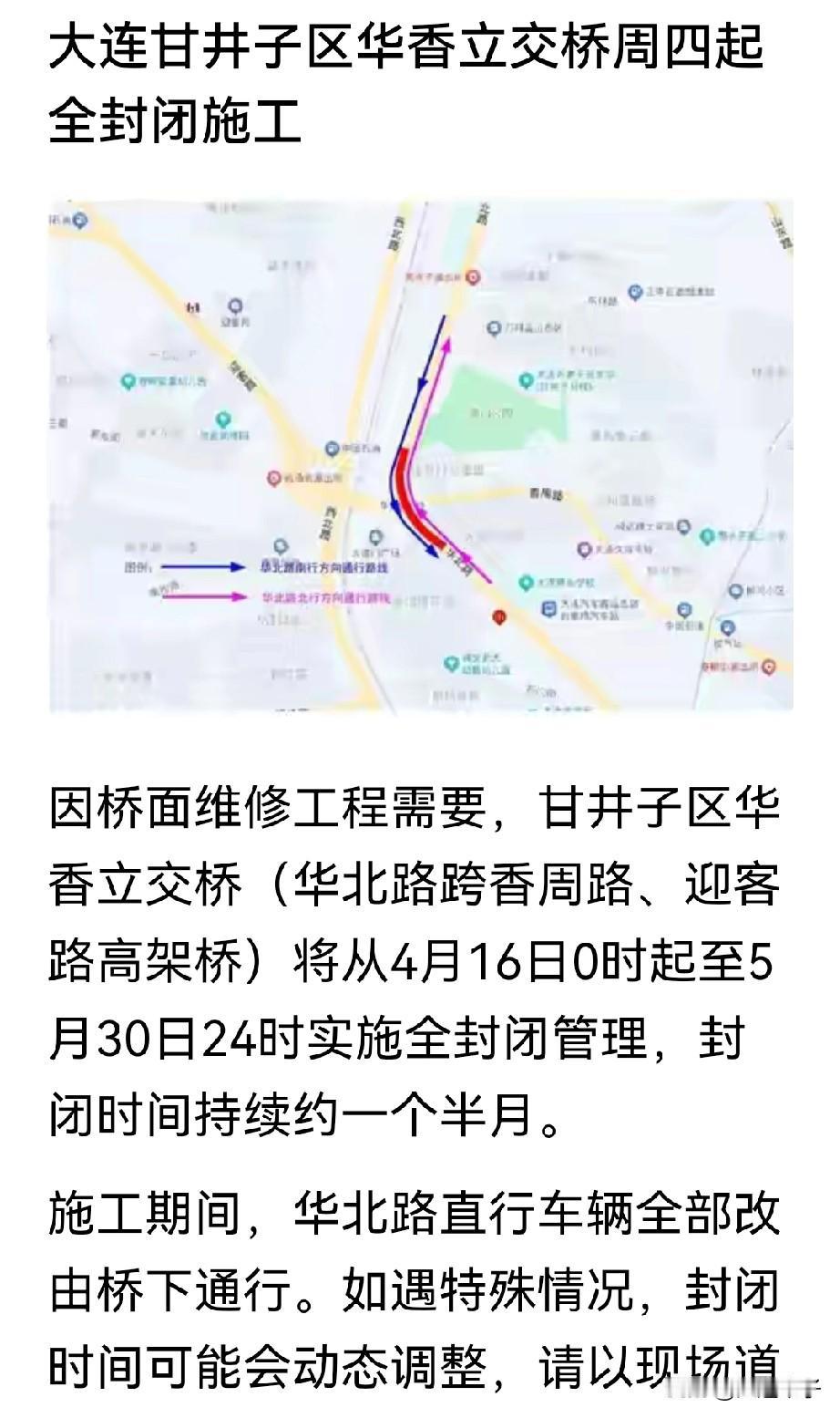 原来甘井子区华香立交桥,(华北路跨香洲路,迎客路高架桥),从 4 月 16 号起(今天),到 5 月 30 日 24 时, 实行全封闭管理,封闭的时间大致是一个半月(图二)。