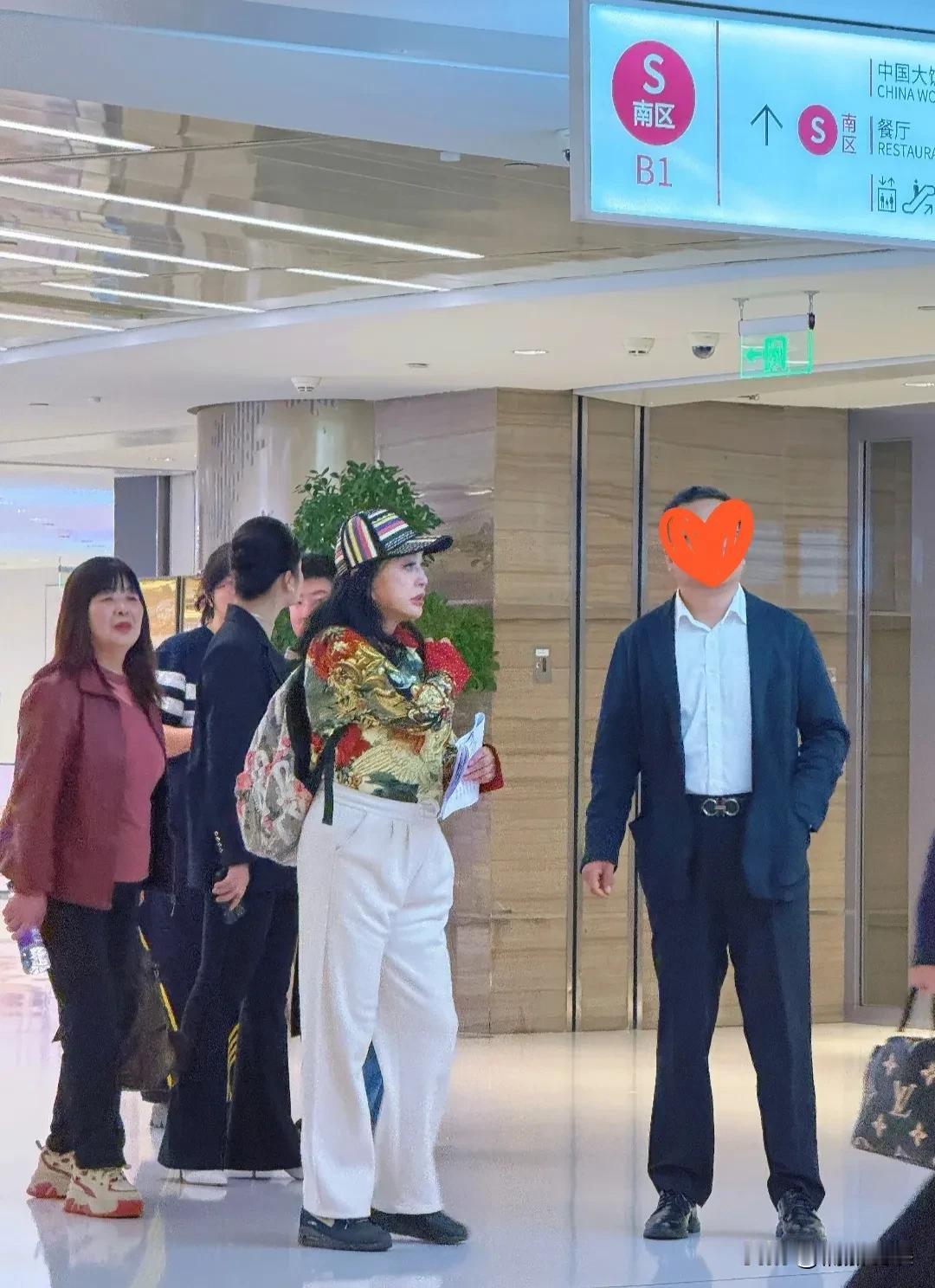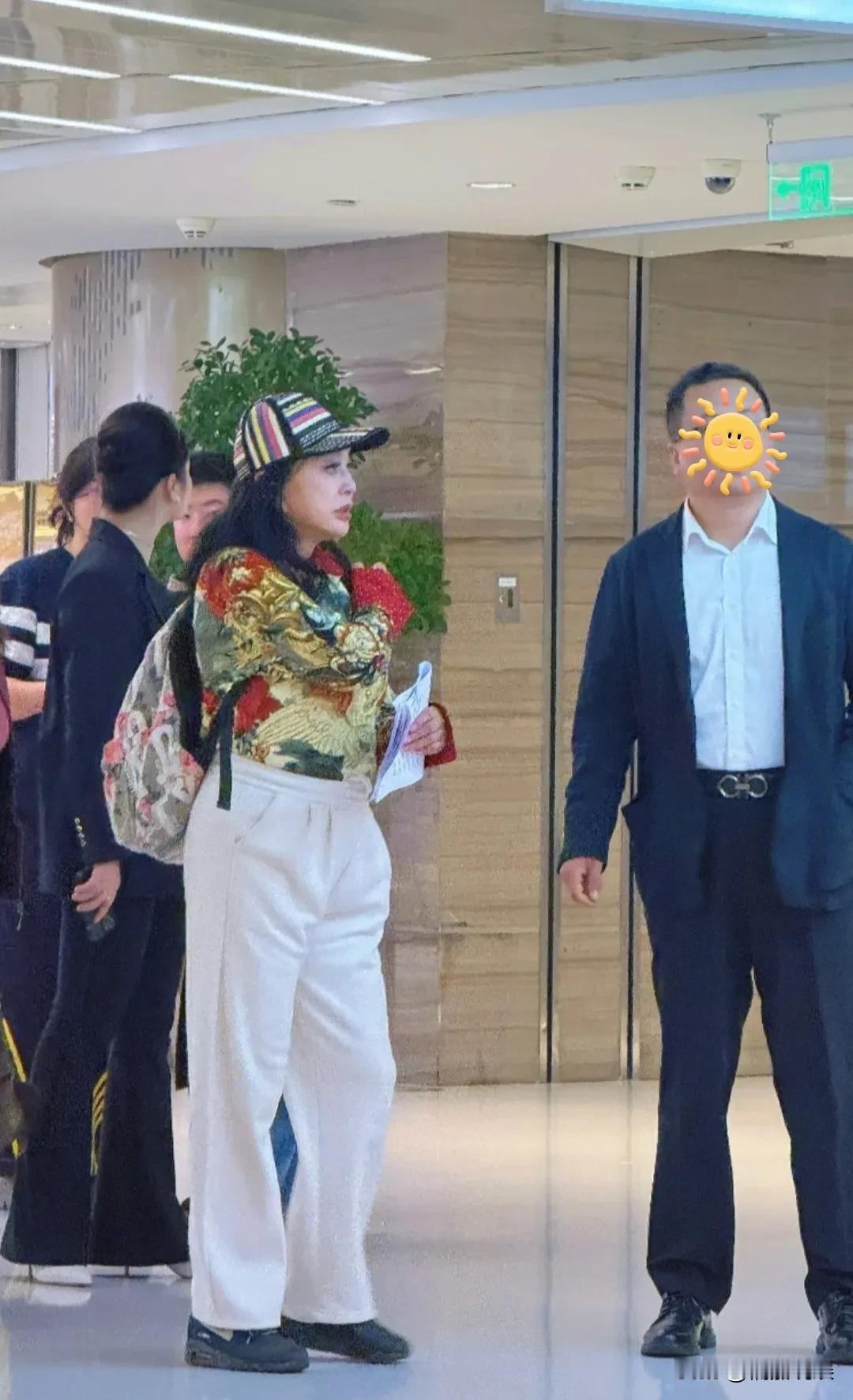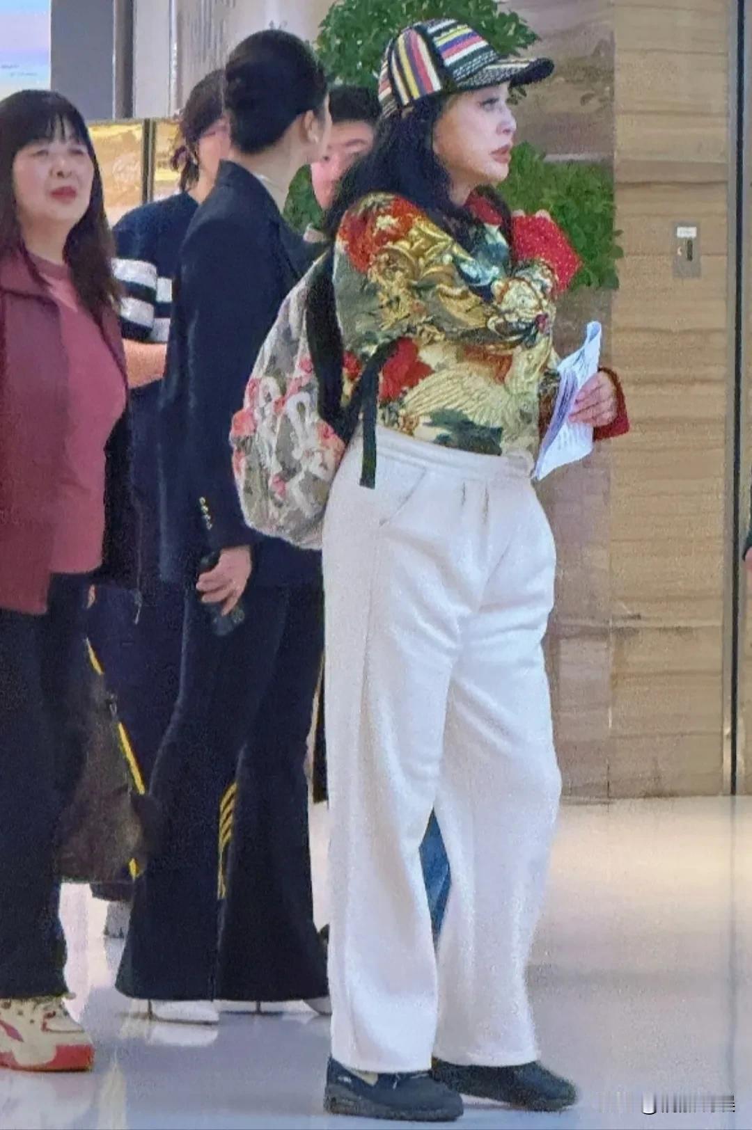 戴着棒球帽的她,穿着一件花衣服、白色裤子,肤色很白,身材看起来发福不少,脸上妆容也挺重的。