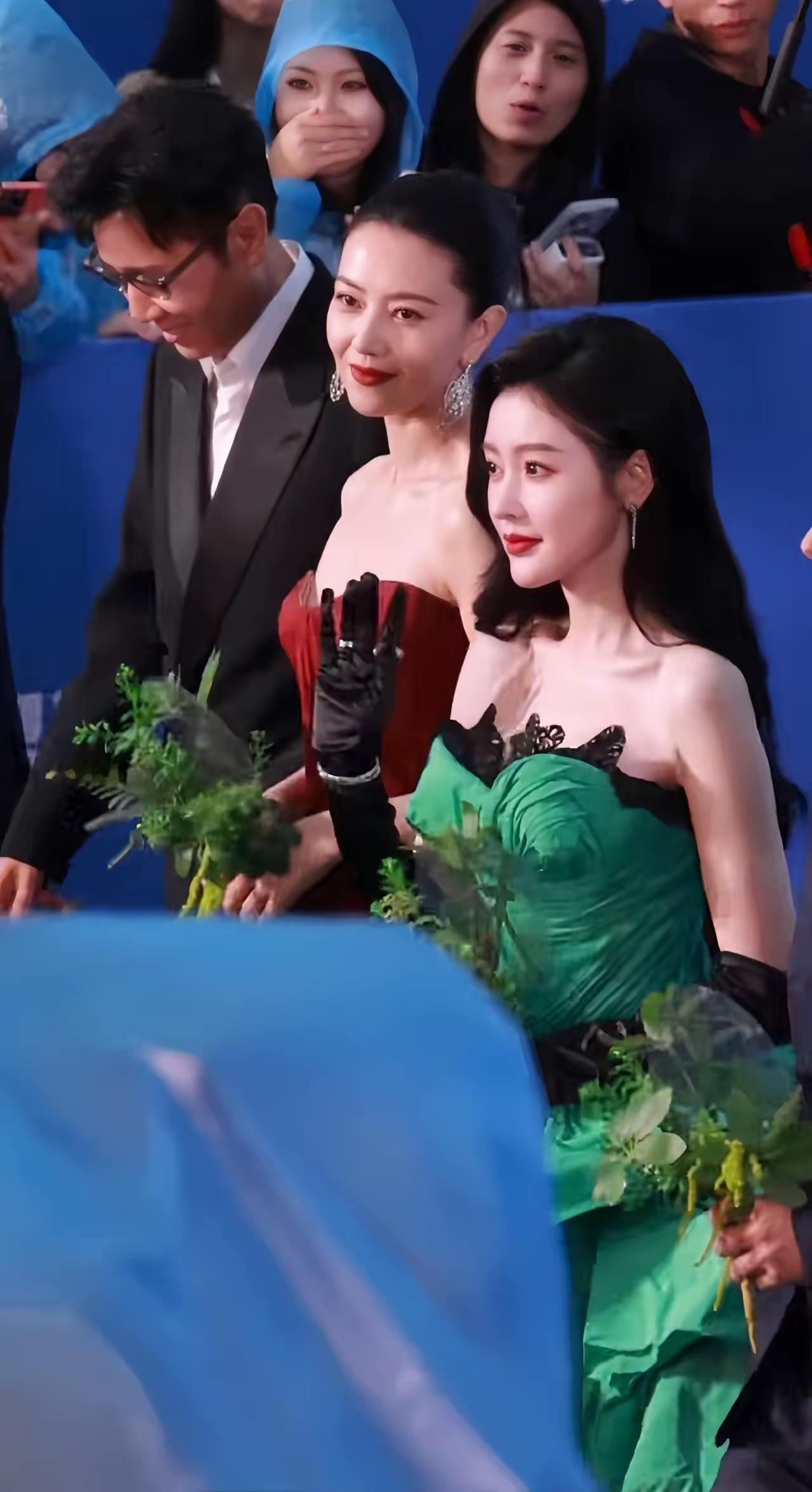 张天爱则是一头大波浪卷发,身着翠绿大摆裙搭配黑蕾丝重工装饰,华丽而张扬,尽显复古的宫廷贵气。