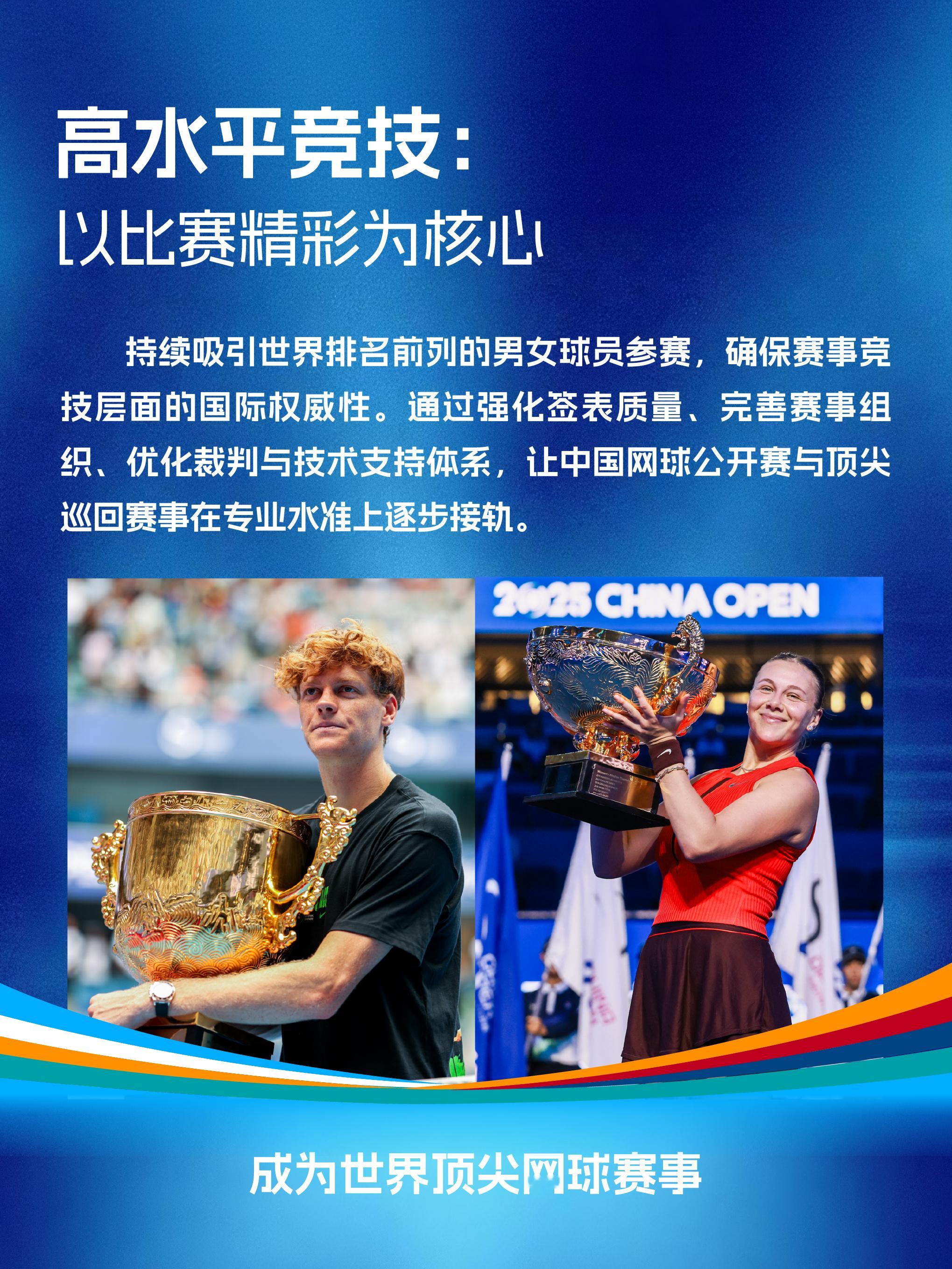 中网中网战略新蓝图 中国网球公开赛中长期发展战略重磅发布:“成为世界顶尖网球赛事”!实现这一目标的“五高”战略路径:🏆 高水平竞技以比赛精彩为核心,持续吸引世界排名前列的男女球员参赛。👑 高规格服务以球员赞誉为标准,持续提升赛事服务满意度。🎉 高满意体验以观众满意为宗旨,丰富赛场休闲娱乐活动。🤖 高科技赋能以科技领先为理念,打造亚洲乃至世界网球科技应用标杆。💎 高价值贡献以经济与社会效益持续增长为目标,拓展媒体版权、会员体系、文体旅融合、衍生品开发等多元渠道,同时推动全民网球、青少年培养与社区联动,成为亚洲网球赛事的最高标杆。新蓝图正徐徐展开,阿中邀你共成长!我的中网独家记忆2026中网
