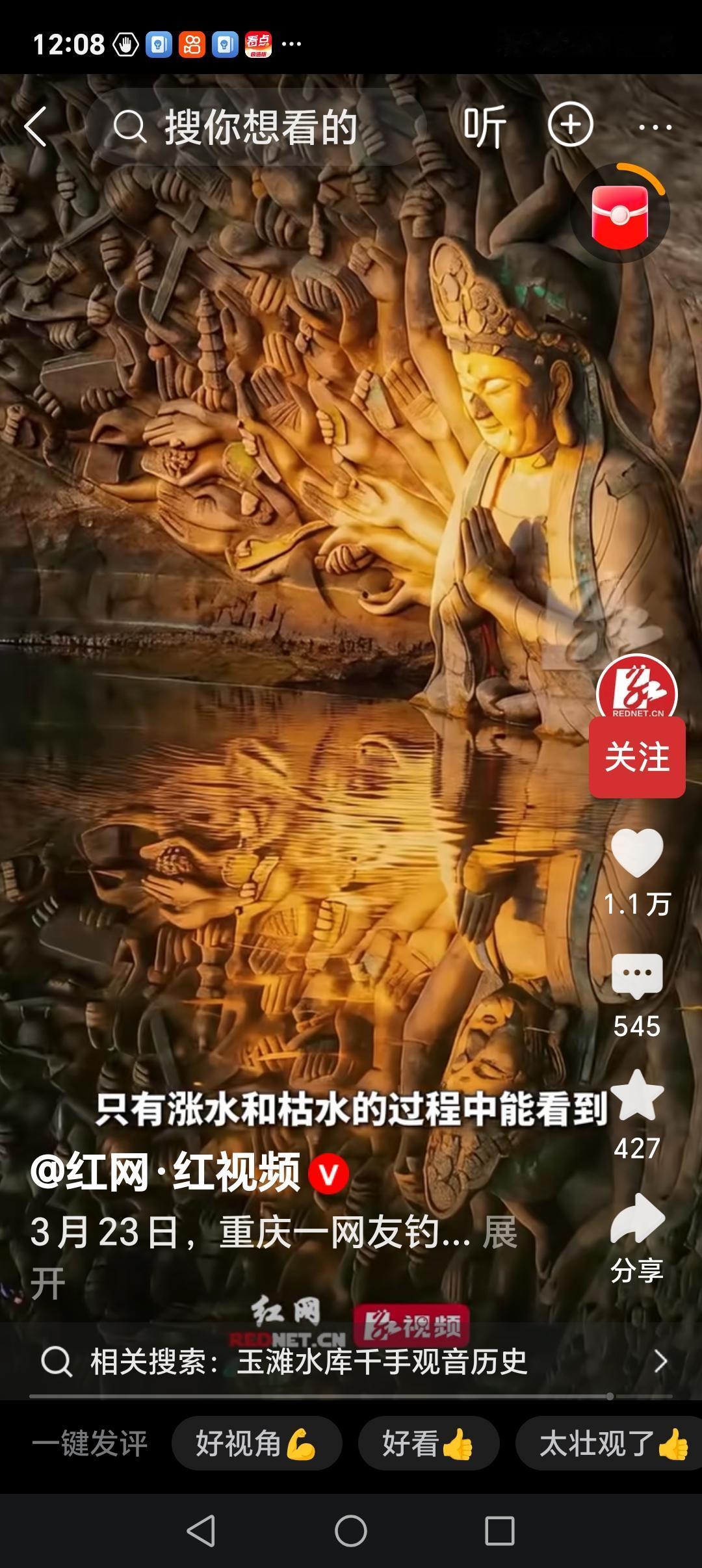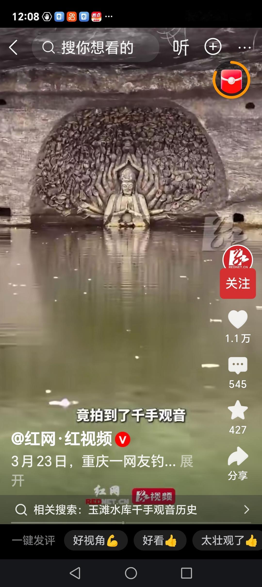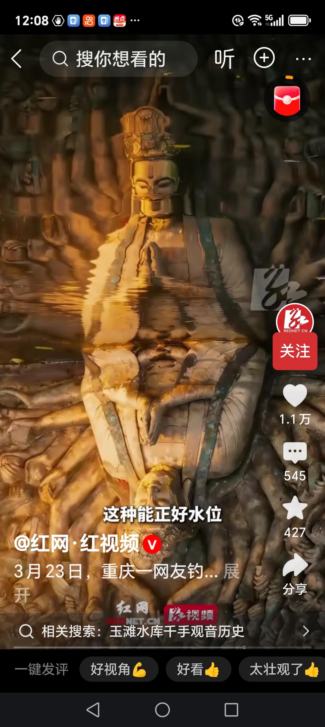 前两天刷到一条新闻,说重庆有个网友去水库钓鱼,鱼没钓上来几条,却发现水里立着一尊千手观音的半身像。水面恰好没过佛像的胸口,倒影映在水里,远远望去,竟像是菩萨端坐水中央,低眉垂目,观照着水面上下的两个世界。