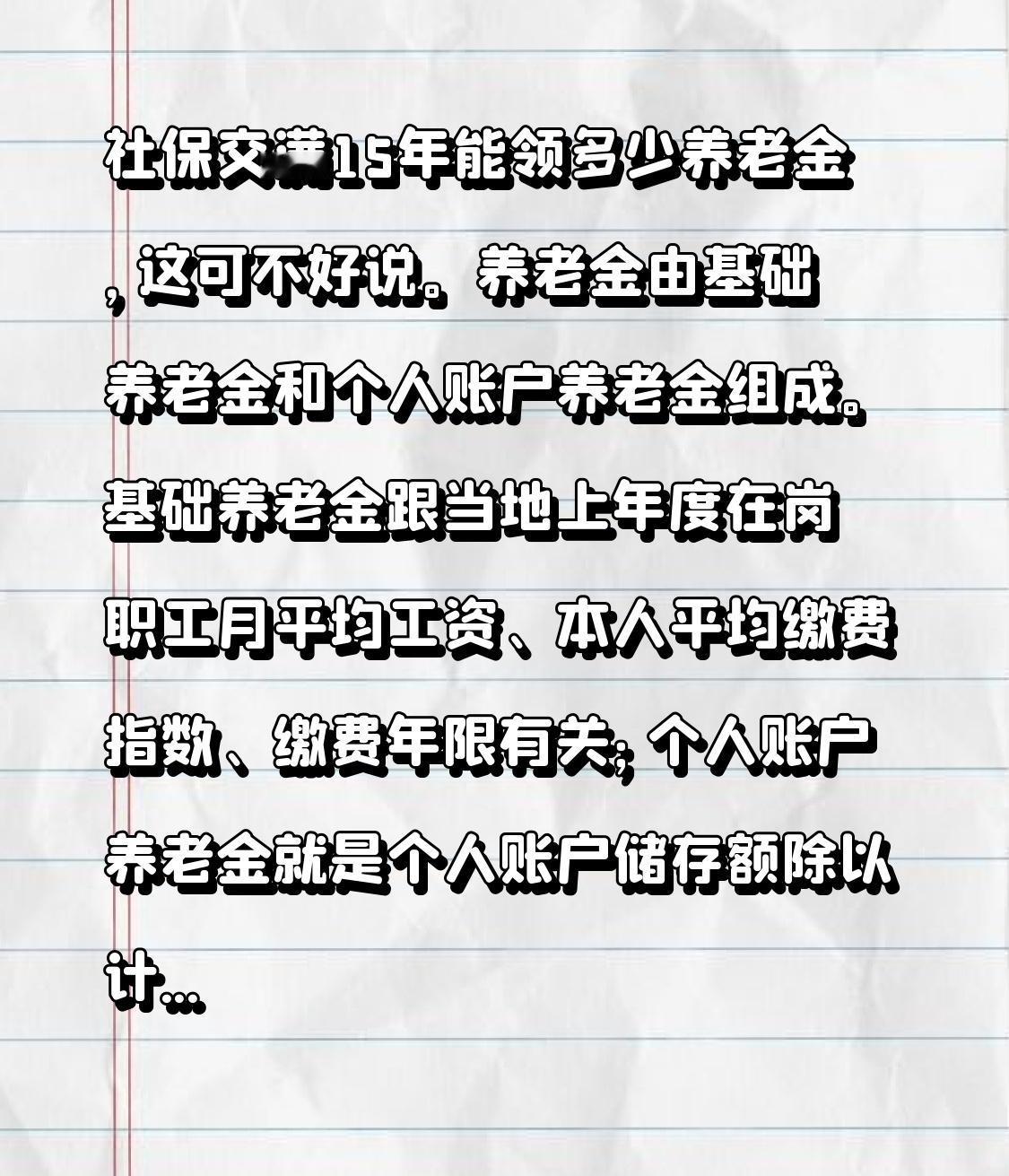 社保交满15年能领多少养老金,这可不好说。养老金由基础养老金和个人账户养老金组成。基础养老金跟当地上年度在岗职工月平均工资、本人平均缴费指数、缴费年限有关;个人账户养老金就是个人账户储存额除以计发月数。
