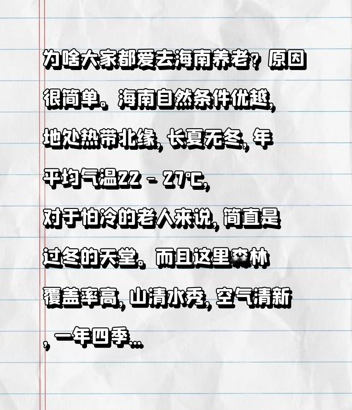 为啥大家都爱去海南养老?原因很简单。海南自然条件优越,地处热带北缘,长夏无冬,年
