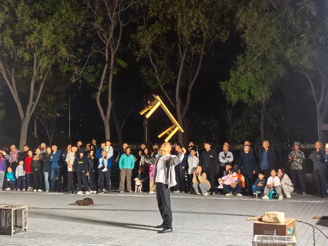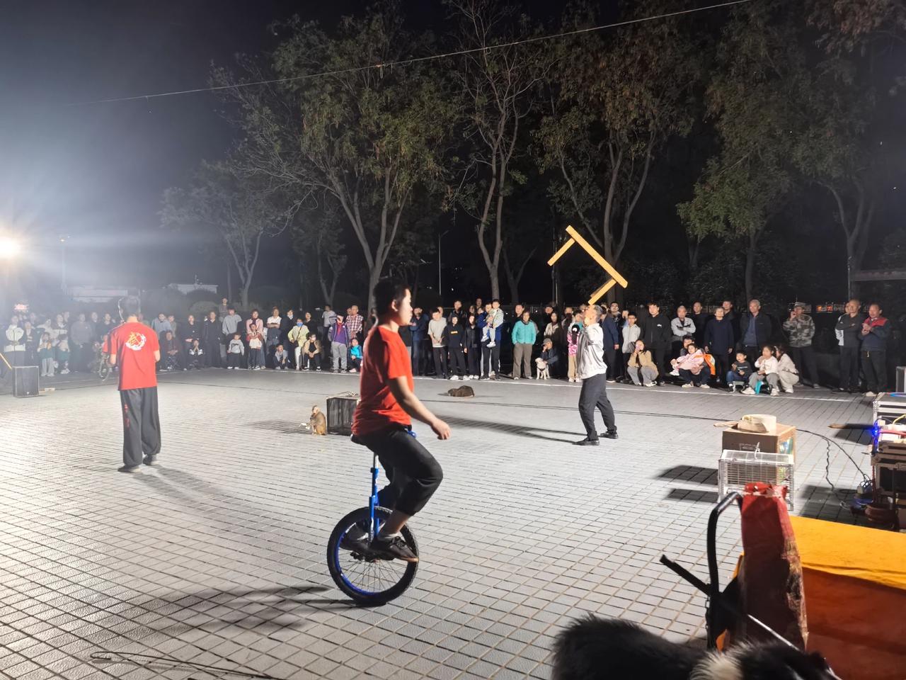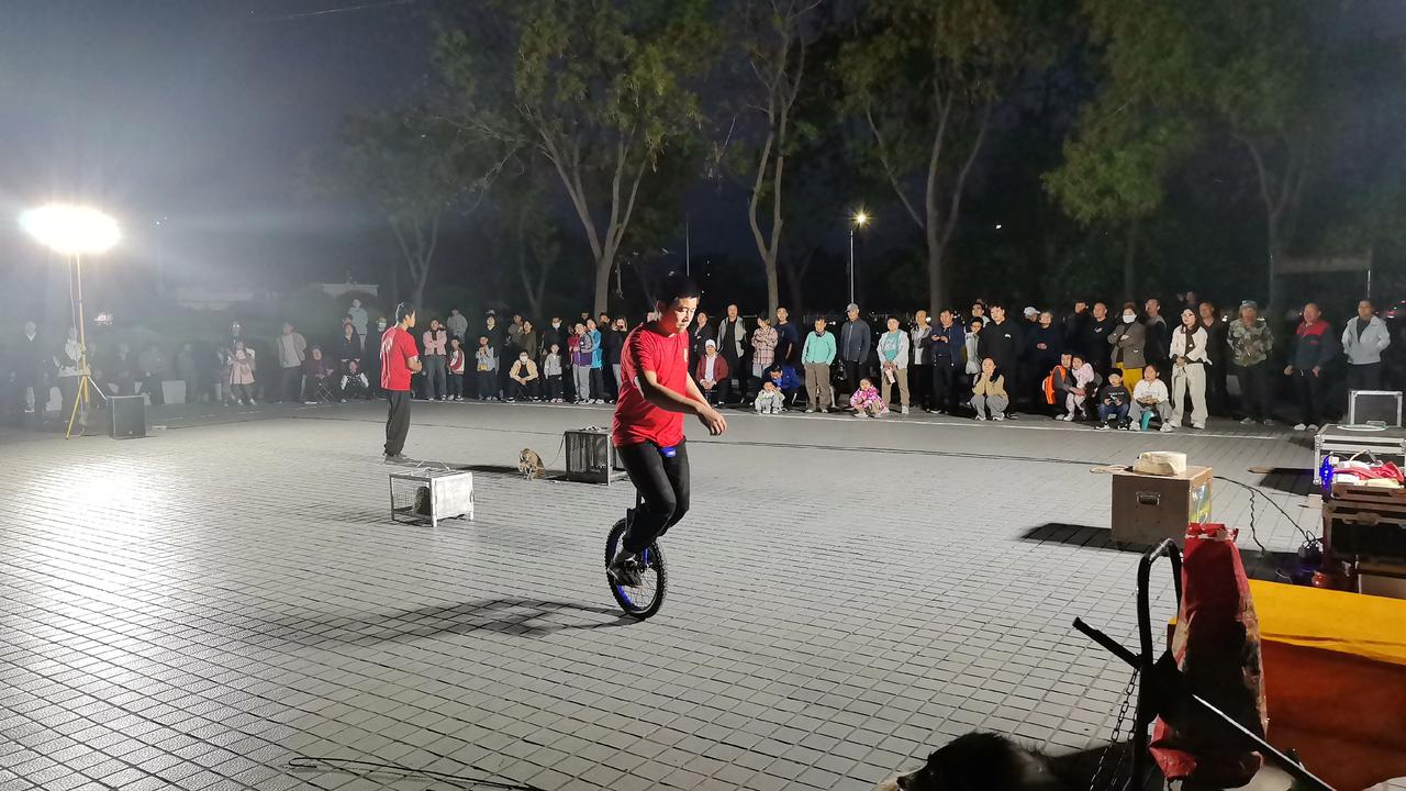 大街上的杂技表演,那可是真正的民间绝活!表演者个个身手厉害,独轮车、狗子穿圈,吹水龙带,翻跟头、耍花样,看得人眼花缭乱。他们在路边露一手,逗得大家哈哈笑,简简单单就把快乐和热闹送给路过的每一个人。(薛金山拍摄) 民间艺术传承 夜间群众文化活动