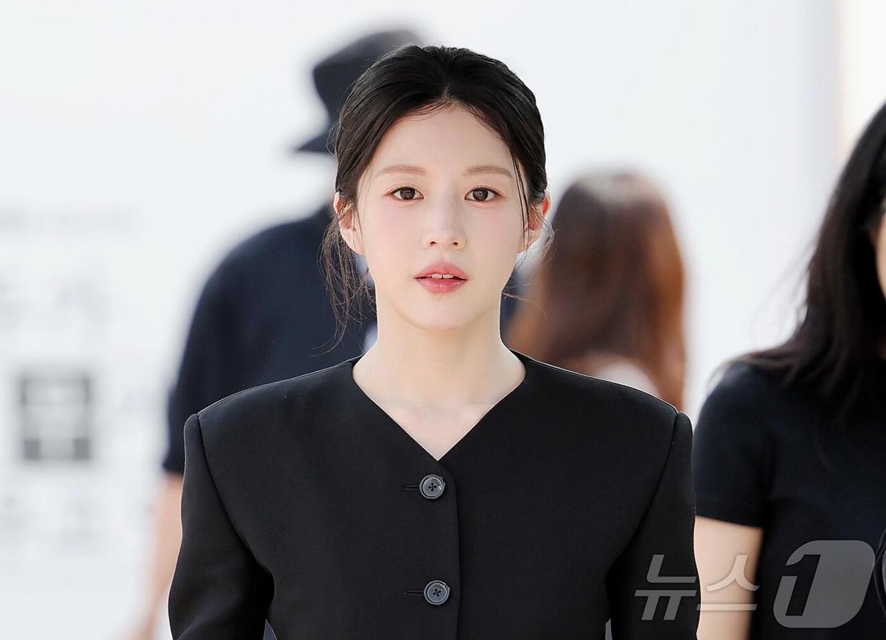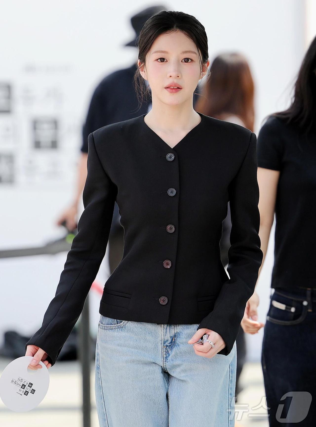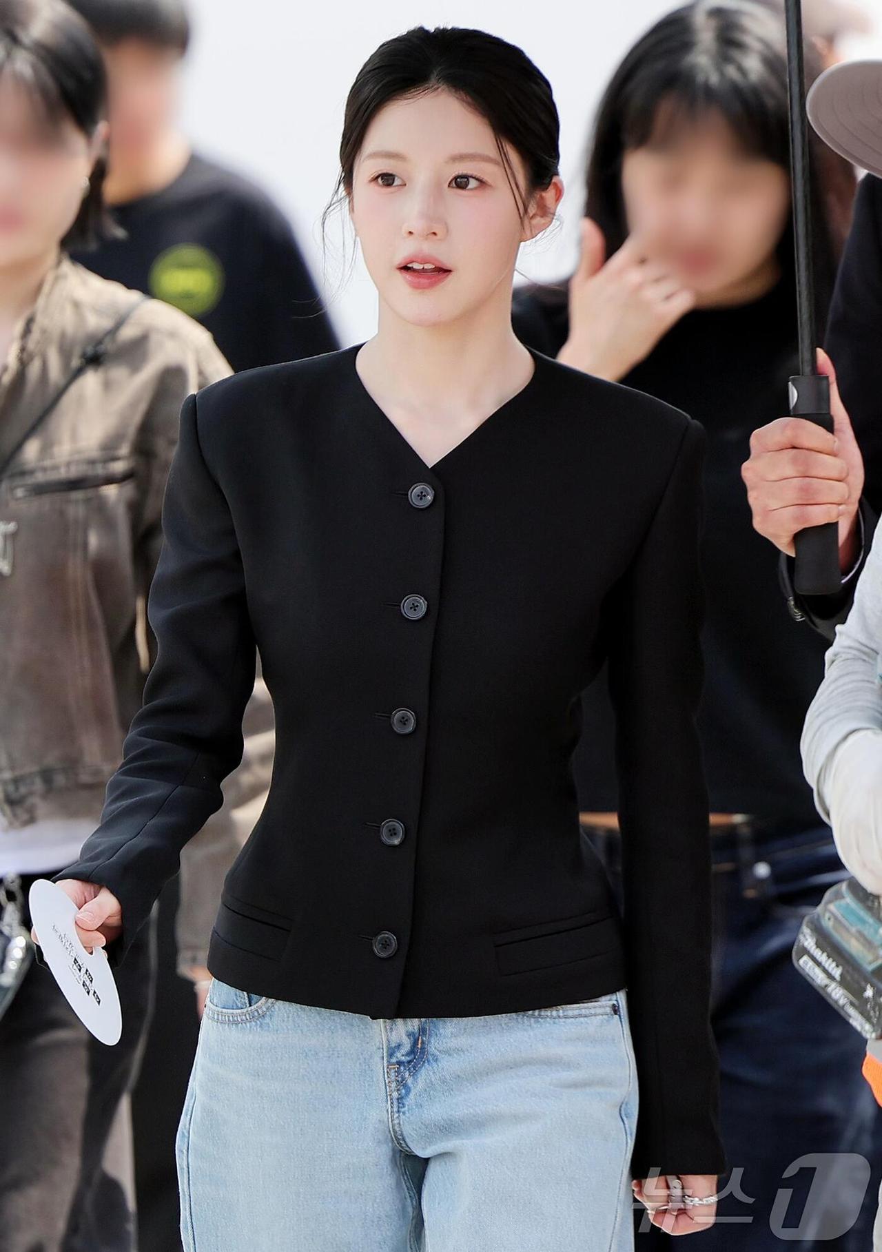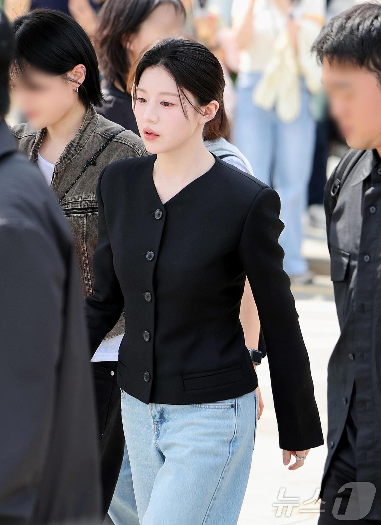 高允真街拍,这套简约又气质! 黑色西装太绝了,V领设计拉长颈线、优化头肩比,收腰