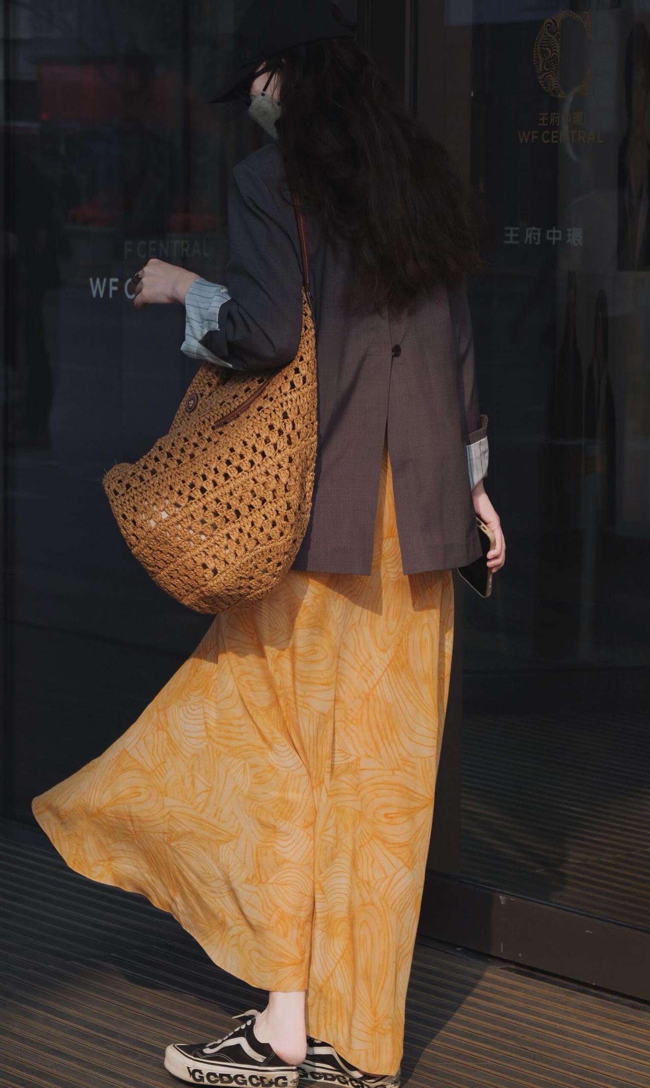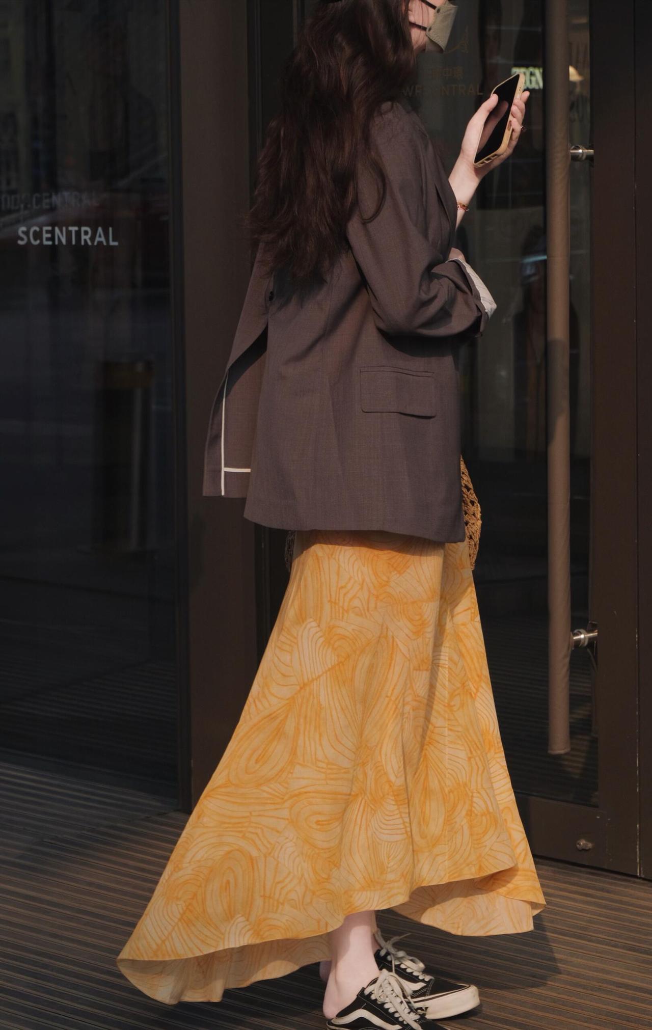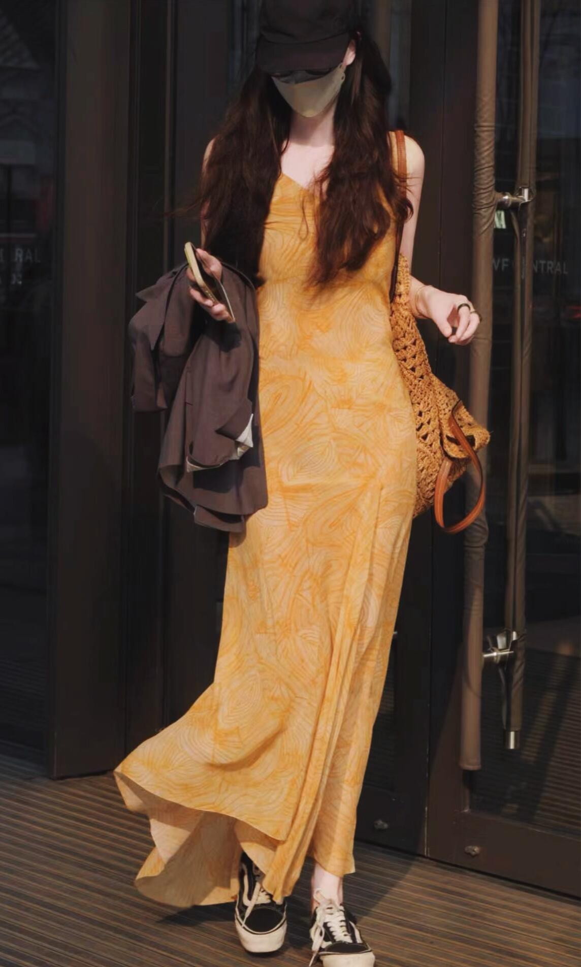 暖黄色晕染吊带长裙自带温柔氛围感,垂坠感裙摆随步伐摇曳,外搭深灰休闲西装,利落版型中和了裙装的柔媚,松弛感拉满。