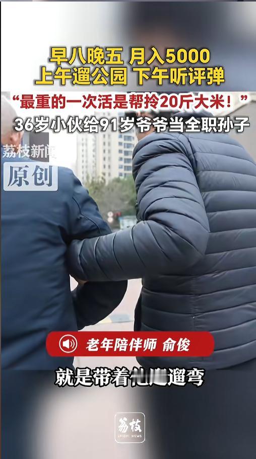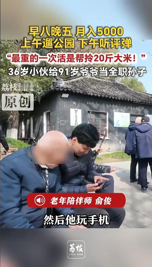 信息来源:《近期,苏州一36岁小伙俞俊因当“全职孙子”陪伴独居老人意外走红。他早八晚五,月入5000块,既不用端屎端尿、也不用擦身做饭,日常就是专职陪着91岁爷爷到公园遛弯、玩手机、听评弹,被网友直呼“神仙工作”。俞俊说,自己这半个月干过最重的活,就是帮老人拎了一次20斤的大米,老人还贴心问他累不累~网友:这工作还招人吗?》荔枝新闻