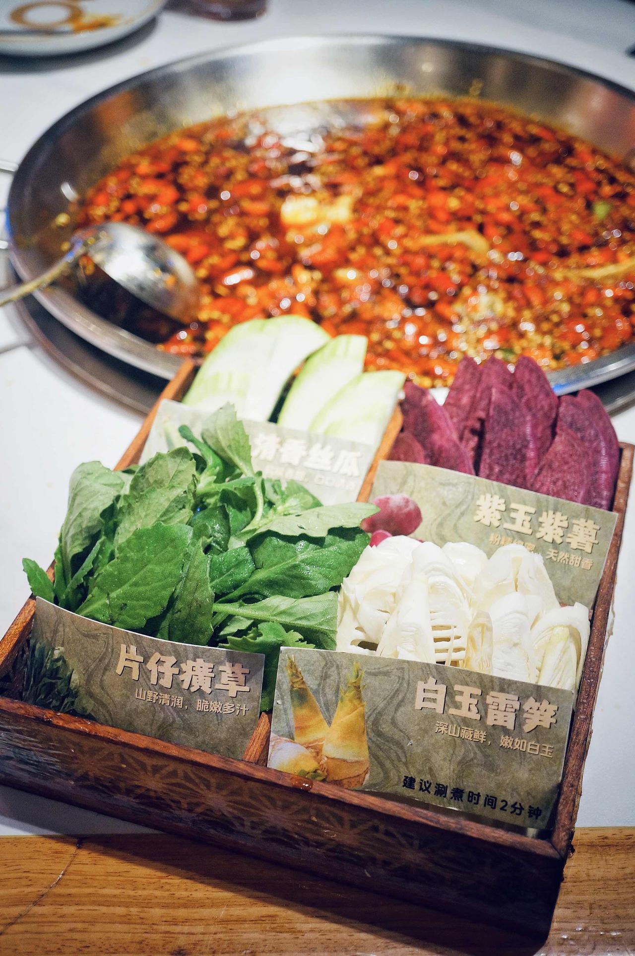 🎋 春日脆嫩笋蔬拼盘:春天就该吃笋啊!拼盘里有现切的白玉雷笋、清香丝瓜、紫玉紫薯、片仔癀草,吸了红油汤之后又辣又香又脆又糯,简直停不下来。